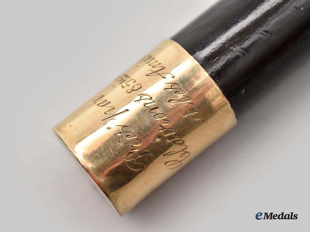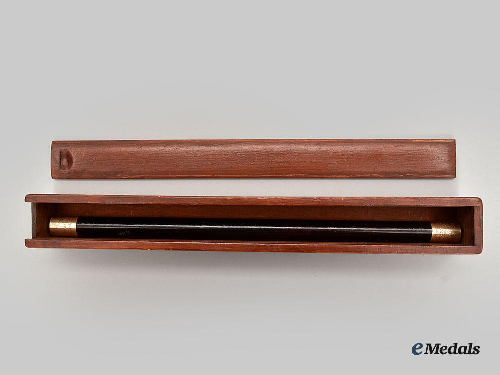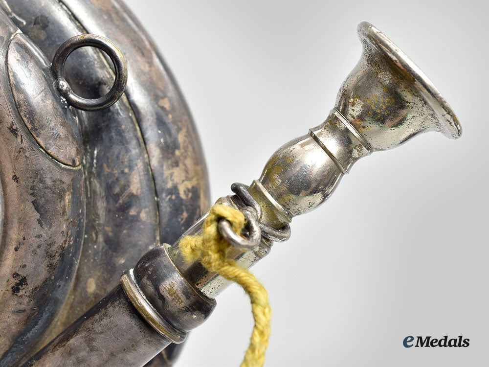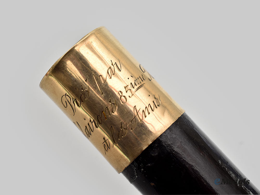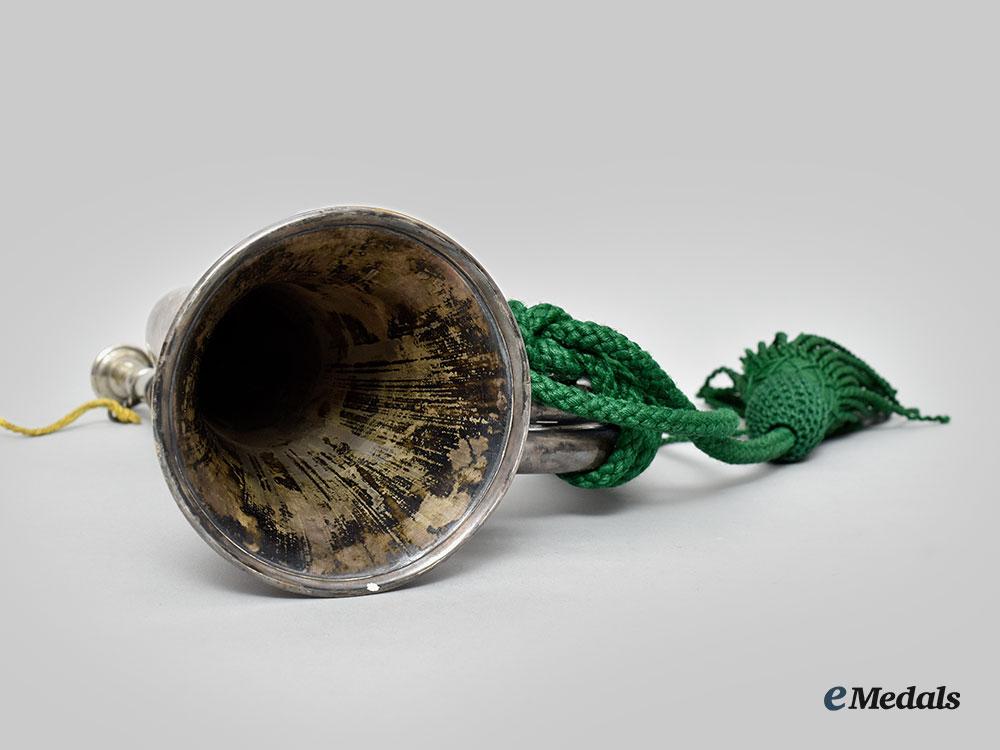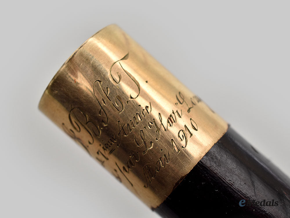 (Carabiniers Mont-Royal). Bugle: in silvered brass, engraved in French in running script "Présente à T.B.A. Tison / Clairon Major / par le / Corps de Clairon / du 65 ième Regt C.M.R. / 1906" (Presented to T.B.A. Tison, Bugle Major, by the Bugle Corps of the 65th Regiment C.M.R. 1906) and maker marked "HENRY POTTER & Co. / 30. Charing Cross. / London / 1900" on the bell tube, measuring 100 mm in width at the bell x 290 mm in length from the bell to the mouthpiece x 175 mm in height, with a braided forest green cord wrapped around the bottom tubing and finished with a large tassel housing an 80 mm long fringe, free of dents; and Baton: gloss black painted shaft with Gold tips placed at both ends, both tips engraved in French in running script, "J.A.B.T. (Tison) / La 7ème Année / Près "par L'Har" (L'Harmonie) Long" / Mai 1910" (J.A.B.T. (Tison) / The 7th Year / Presented by the Harmony Long" / May 1910) on one tip and "Près "par / Clairons 8 ième Regt" / et les Amis" (Presented by Buglers of the 8th Regiment and Friends) on the other tip, measuring 19.5 mm in diameter x 367 mm in length, exhibiting contact marks on the Gold tips and scuffing in a few locations on the black painted finish on the shaft, the baton housed in a wooden box with a sliding lid, the box measuring 385 mm in width x 47.2 mm in depth x 53 mm in height. Rare.