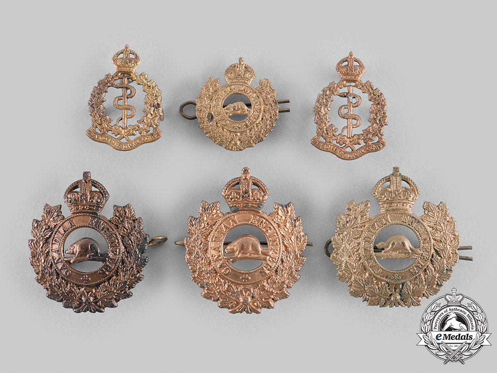 Includes: three Canadian Engineers General Service Cap Badges (two in browning copper, one in browning brass, measuring 41.5 mm (w) x 48.8 mm (h), 41.5 mm (w) x 47.7 mm (h) and 43.7 mm (w) x 47.5 mm (h) respectively, all three with intact lugs and pin); Canadian Engineers General Service Collar Badge (in browning brass, measuring 28 mm (w) x 32 mm (h), both lugs and pin intact); and Canadian Army Medical Corps Collar Badge Pair (in browning copper, measuring 25.8 mm (w) x 36 mm (h) each, one with replacement lugs, the other with one of two lugs intact). Ranging from fine to near extremely fine.