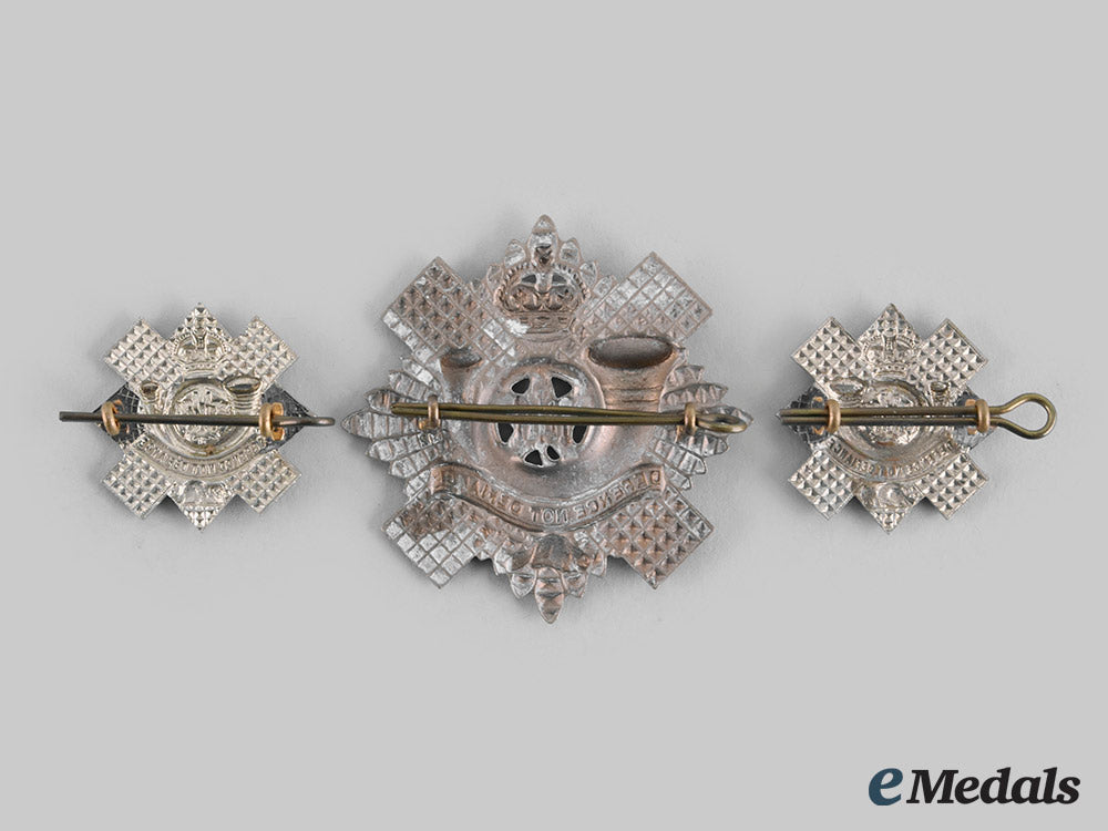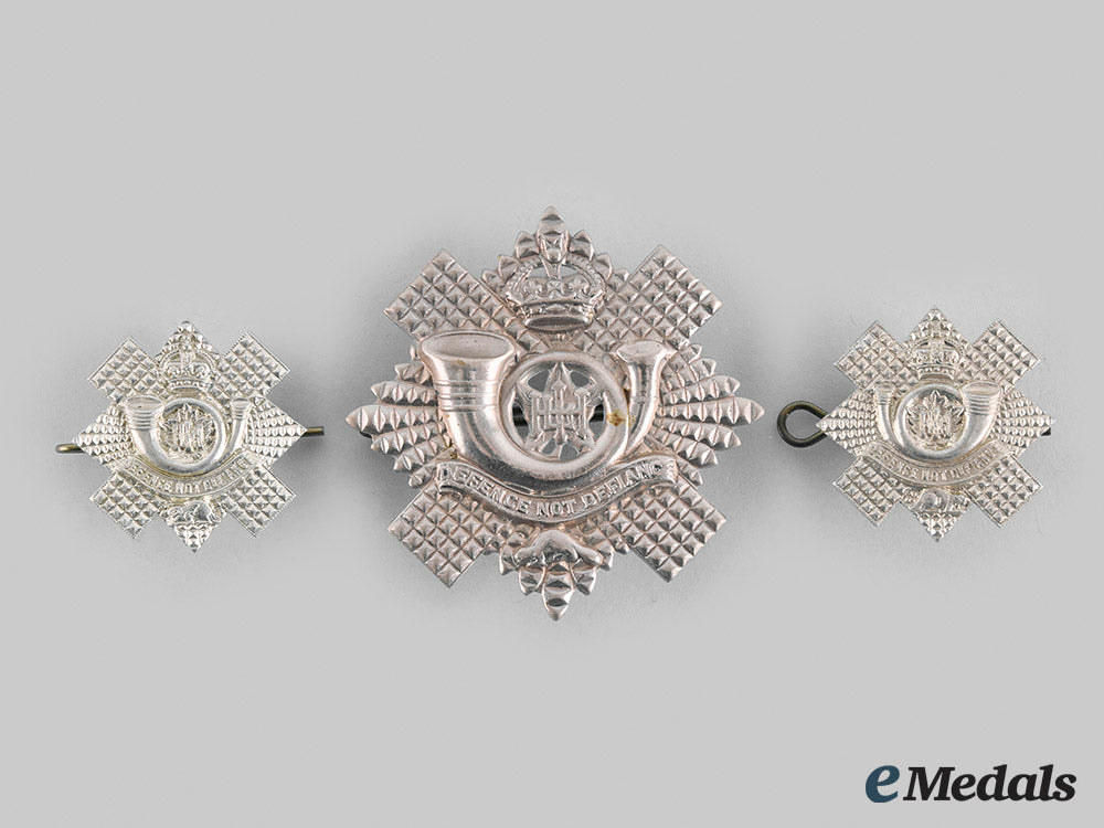 Glengarry Badge (in white metal, voided, unmarked, measuring 57.8 mm (w) x 57.3 mm (h), both lugs intact); and two Collar Badges (in white metal, unmarked, 32.5 mm (w) x 32.5 mm (h) each, both with intact lugs and pin). Very light contact, near extremely fine.