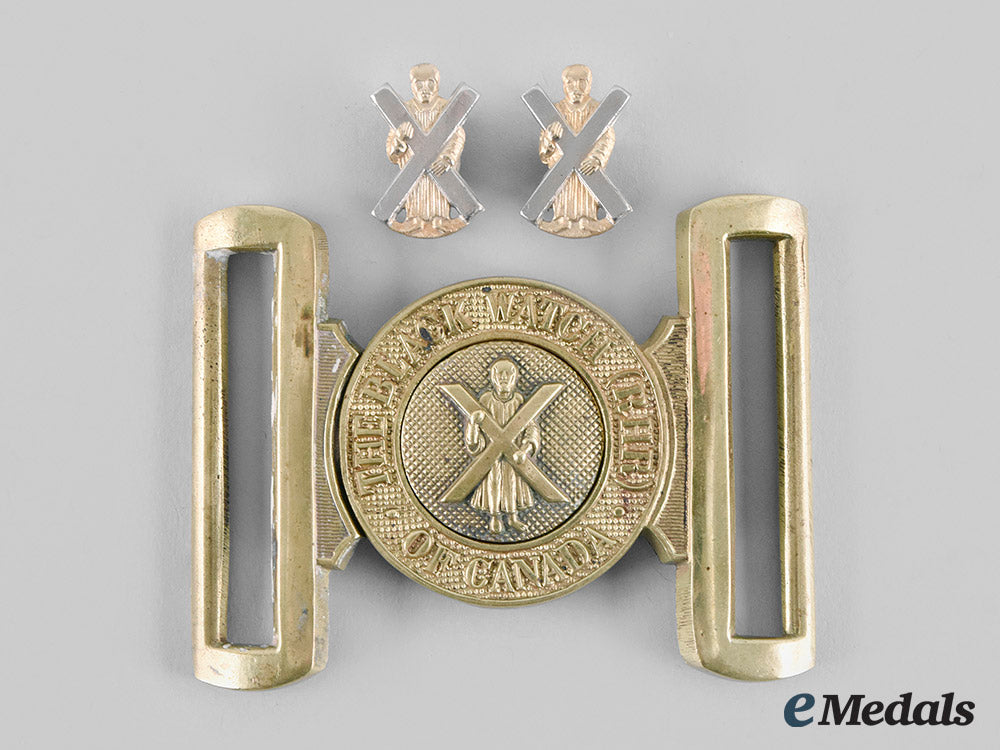 Belt Buckle (two-piece construction, the left piece with a tab bearing the regimental insignia on a stippled background, with a belt loop on the left end, the right piece slotted in the centre in order to receive the aforementioned tab, the slotted area surrounded by a circular ring inscribed "THE BLACK WATCH (RHR) OF CANADA", with a belt loop on the right end, unmarked, measuring 94 mm (w) x 73 mm (h) when linked together, spotting, residue evident on the reverse and on the belt loops from cleaning); and two Collar Badges (in gilt on white metal, unmarked, two measuring 17 mm (w) x 26 mm (h) each, both intact lugs). Better than very fine.