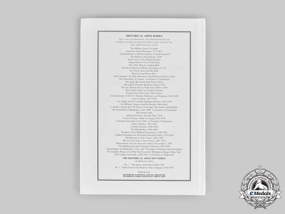 This is an extremely well-preserved edition of “Trade Guns of the Hudson’s Bay Company 1670-1970”, by S. James Gooding. It is constructed of a glossed heavy card stock binding, with the exterior of the cover featuring an image of flintlock rifles flanked by title and author. The reverse bears an extensive list of other publications published by Museum Restoration Service as part of the Historical Arms Series. The interior content of the book consists of 158 glossed white card stock pages with extensive historical accounts of the role of firearms in the history of the Hudson’s Bay Company, as well as descriptions of the weapons, supplemented by black-and-white photographs. It was published in 2003 by Museum Restoration Service of Bloomfield, Ontario, and Alexandria Bay, New York. The book measures 180 mm (w) x 255 mm (h) and is in an extremely fine condition.