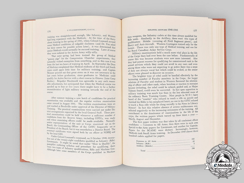 Hardcover, fire orange cloth cover, entitled "UWO Contingent COTC: The History of the Canadian Officers' Training Corps at the University of Western Ontario" by Hartley Munro Thomas, published by The University of Western Ontario, London, Canada in 1956. It documents the organization of the COTC at UWO during the First World War and its subsequent involvement in the war, followed by the Inter-War years and its participation in the Second World War, under its various commanders. It is divided into ten chapters: 1 - Introduction; 2 - Lieut.-Col. T.J. Murphy 1915-1919; 3 - Interregnum - 1920-1922 and Colonel W.J. Brown VD, 1922-1930; 4 - Lieut.-Col. E.E. Reilly 1931-1937; 5 - Lieut.-Col. A. Woods 1937-1939 / Lieut.-Col. G.W. Little, OBE MVO MC ED 1939-1940; 6 - Colonel Leonard 1940-1943; 7 - Air Training and Organization of the UATC (University Air Training Corps); 8 - Lieut.-Col. Frank Steling 1943-1947; 9 - Assumption College; 10 - Waterloo College. It finishes with a Conclusion, Sources and Authorities, Appendix, and Index. The book contains 424 pages of text, printed in black ink, on an off-white paper stock, plus twelve pages of black and white plates placed between pages 16 and 17, with fifteen photographs, illustrating nine commanders, along with six group shots, on a white coated paper stock, measuring 155 mm (w) x 235 mm (h) x 32 mm (d). It exhibits scuffing on the cover, however, it has experienced wear along the inner hinge on the back cover, exposing the underlying binding. Very fine.