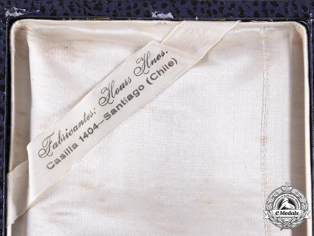 (Orden al Mérito). Instituted 1906. 1925-present Issue. In silver gilt, a ball-tipped enameled white five armed star, surrounded by a gilt detailed laurel wreath, both over a multi-rayed ten-pointed sharp gilt plaque, the obverse centre bearing a partially enameled Chilean coat of arms, encircled by an enameled blue ring inscribed ORDEN AL MERITO CHILE, reverse with principle pin assembly flanked by two stays, measuring 71.80 mm (w) x 73.23 mm (h), light contact, minor surface wear and tarnished silver, with slightly detached centerpiece, otherwise very fine condition. Accompanied by the case of the class, constructed of a wood frame with a blue hard-shelled exterior, the obverse lid embossing the Chilean coat of arms below of the inscription REPUBLICA DE CHILE, the interior with a padded white satin lid liner, with ribbon inscribed with a maker’s mark of “Fabricantes Houss Hmos. Casilla 1404 - Santiago (Chile)”, with removable depressed and slotted medal bed, with replacement catch and hook, measuring 115 mm (w) x 42 mm (h) x 230 mm (l), case with surface wear, fine condition. A rare set in very good condition.
