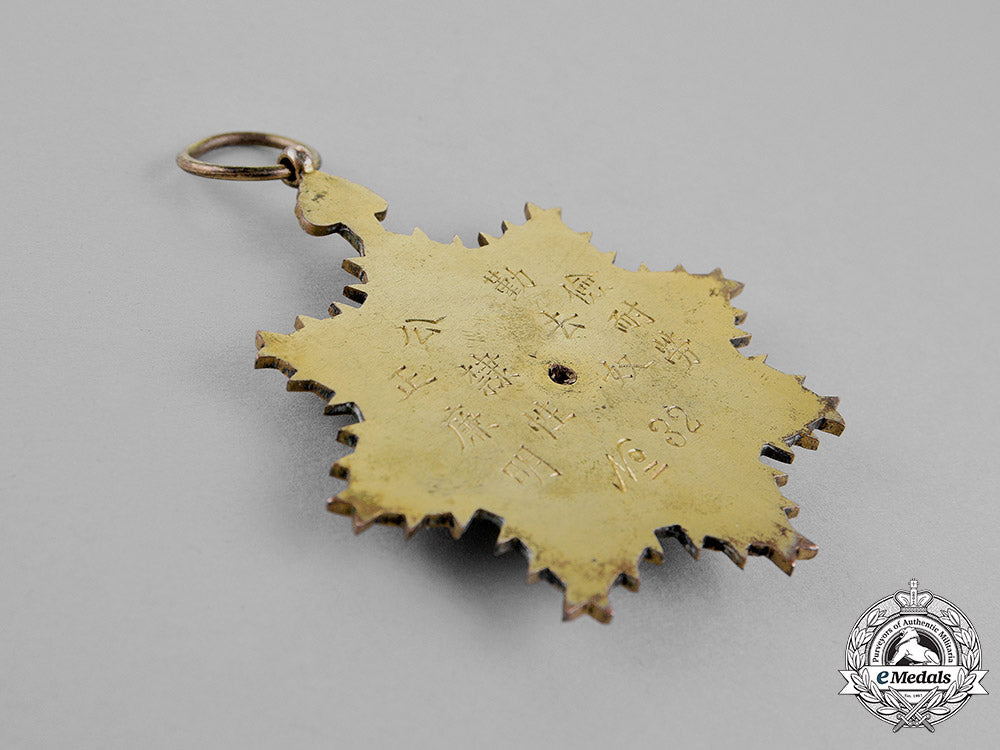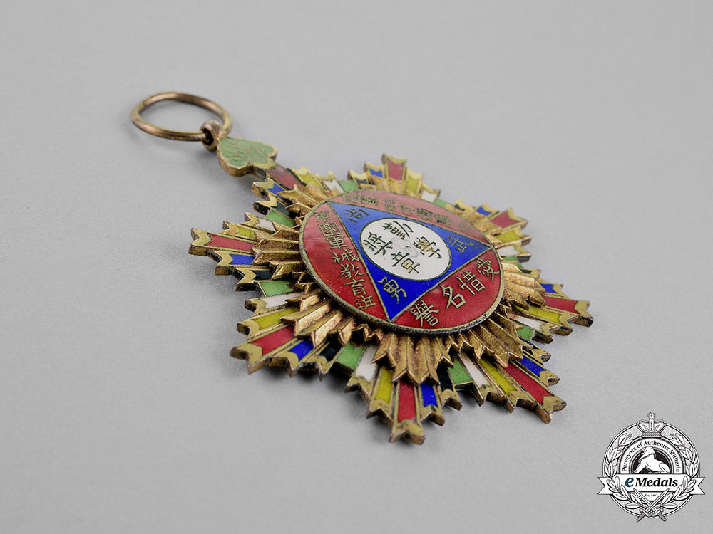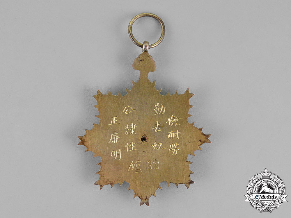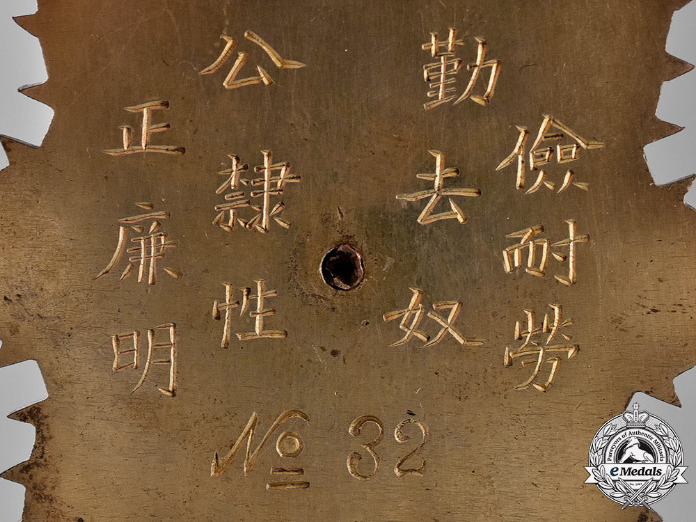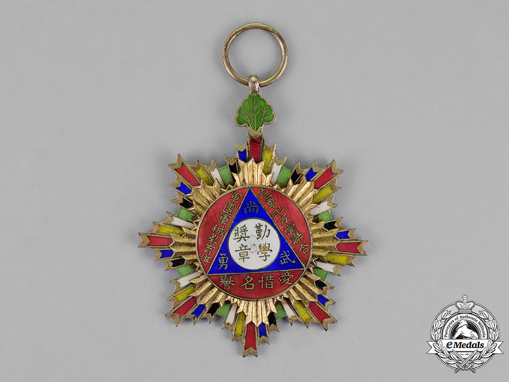 In bronze gilt with red, white, blue, yellow, green and black enamels, obverse centrepiece with Chinese characters, white circle in the centre inscribed "Reward Medal for Studying Hard", the circle within a blue triangle with characters in each of the three corners inscribed "Nobleness / Brave - Valiant / Related to Military - Ability to Fight", the triangle itself within a large red circle with characters on the three sides inscribed "Ordnance Education Class of the Legion / Joint of Four Three Ground Force / Cherish Reputation", reverse inscribed "Hardworking and Thrifty" and number engraved "No 32", measuring 63.5 mm (w) x 78.3 mm inclusive of its integral loop, ring suspension, scattered chipping evident on a few emamelled rays and in the white enamels on the centrepiece, near extremely fine.