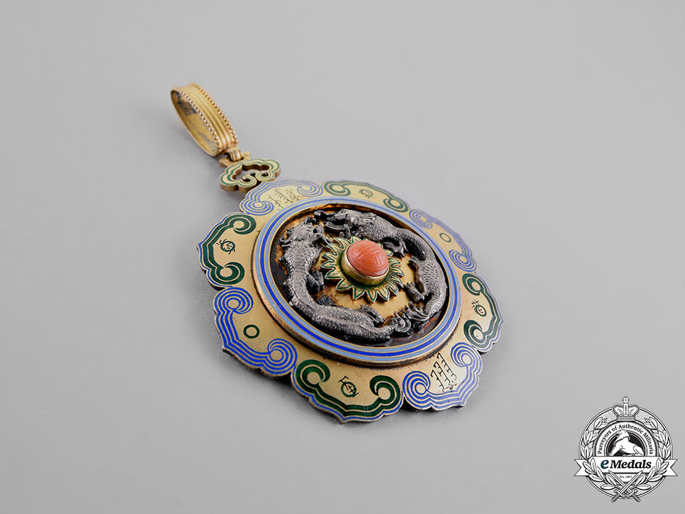 (双龙宝星). (Shuānglóng Bǎoxīng). Instituted by Guangxu Emperor on the 7th of February 1882. Type I. 1882-1897 Issue. A superb and exceedingly scarce Austrian made award commissioned by the Qing Government for foreign recipients in Western countries. A large award consisting of eight alternating blue and green peddles, obverse centre with blue enamel surround, in accordance with the Statutes detailed in 1882, this second class award presents two ornately designed silver dragons on a gilt background, both circling a polished coral stone denoting 3rd Grade, reverse with hook suspension attachment, Thunder Cloud suspension hallmarked with F.R. for Rothe, as well as the Austrian silver hallmark ("3" Dog's Head "A") denoting 800 silver content, measuring 67 mm (w) x 81 mm (h- inclusive of Thunder Cloud suspension), with light wear and enamel loss from use, elongated and detailed neck loop, with replacement scarlet ribbon, near extremely fine.