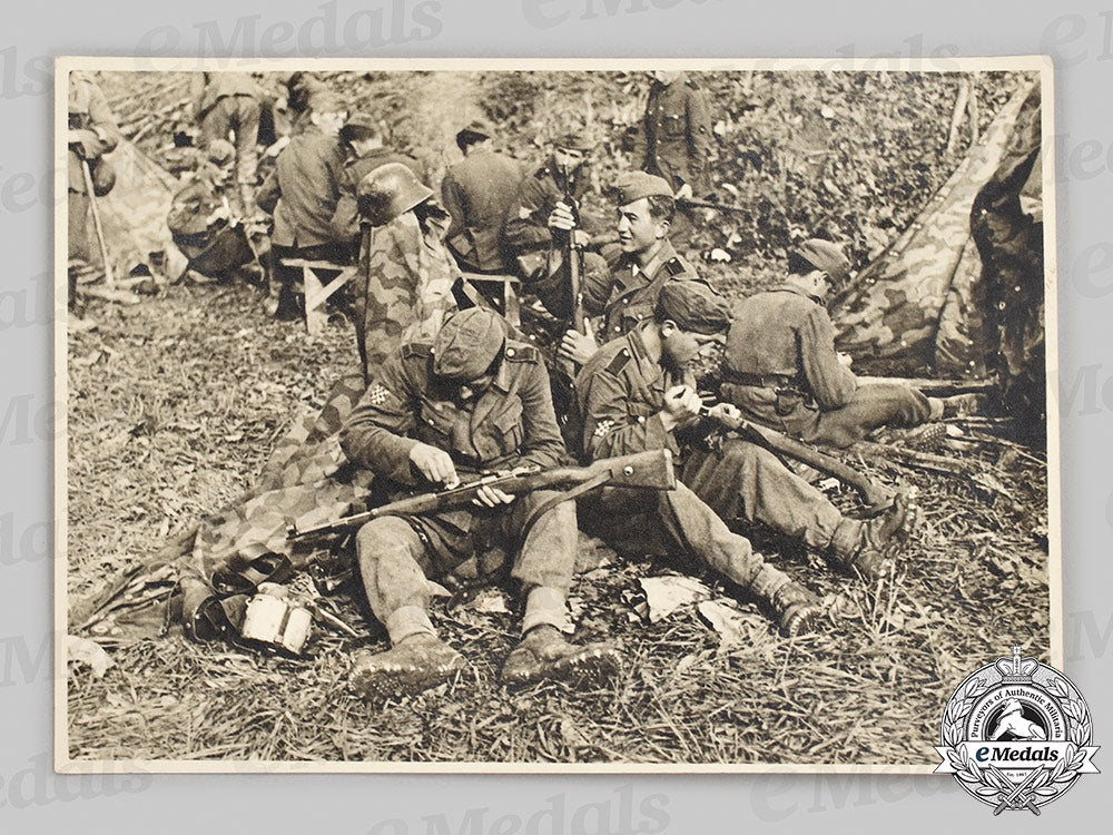 (Kolajna Ante Pavelić za junaštvo). Instituted in 1941. In silver, measuring 35.3 mm in diameter, a series of nicks evident on Pavelić's cheek and neck, on its original triangular ribbon with hook and eye, very fine. Accompanied by a Photograph of Twelve Members of the Home Guard in a Wooded Setting (in black and white, matte finish, stamped in ink "VII - 68" and inscribed "Domobrani na Položaju" (Home Guards at the Position) in pencil on the reverse, measuring 175 mm (w) x 125 mm (h), paper residue on the reverse from previous album mounting, near extremely fine).