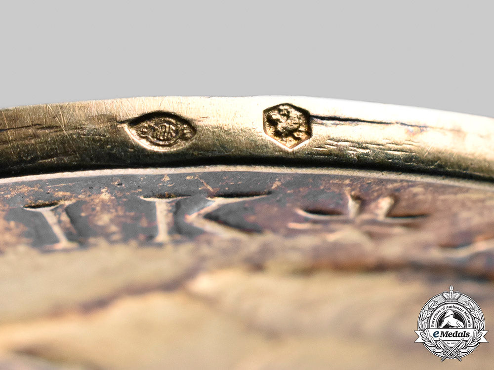 (Velika zlatna kolajna Poglavnika Ante Pavelića za hrabrost). Golden Medal of Poglavnik Ante Pavelić for Bravery, struck in silver gilt, 40.2mm in diameter, it weighs 28.0 grams (without ribbon); with maker's mark "NDH" stamped on the rim (for Croatian State mint), also stamped on the rim with an official silver hallmark (rooster), with test mark at 9 o'clock, otherwise in mint condition and very rare. With correct, but modern made ribbon.