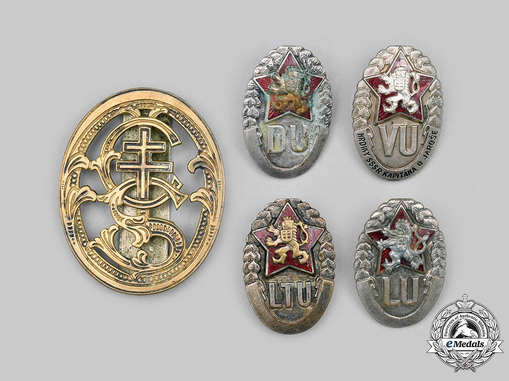 1. four Military School Badges: DU = Artillery School (Delostrelecke Uciliste), numbered "2414"; VU = Military School of Hero of Soviet Union Captain O Jaros (1958-) (Vojenske Uciliste Hrdiny SSSR Kapitana O Jarose), numbered "1289"; LTU = Air Force Technical School (Letecke Technicke Uciliste), numbered "1402"; LU = Air Force School (Letecke Uciliste), numbered "2752" (each badge with a two-piece construction, in silvered bronze with red enamels, number impressed on the reverse, the first two measuring 24.5 mm (w) x 36.3 mm (h), the latter two measuring 24.2 mm (w) x 36 mm (h), all four with a screwback maker marked "ZUKOV" and support plate);