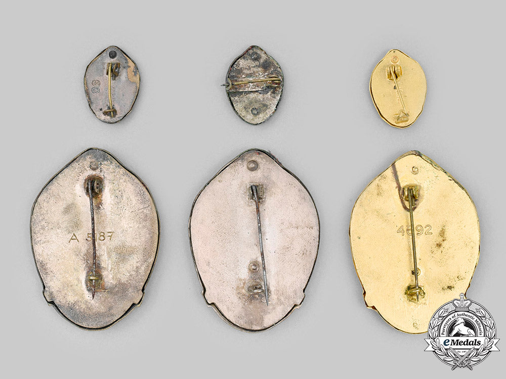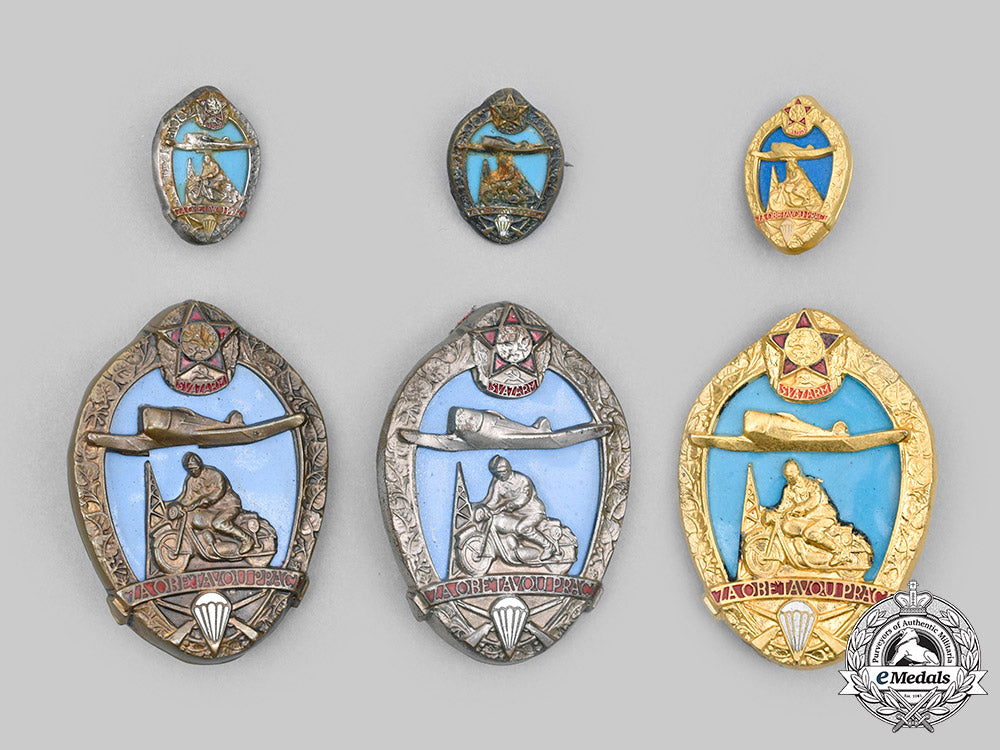 Union for Co-Operation with the Army (Svazarm). Gold, Silver and Bronze Grades, Fullsize and Miniature of each. All six with a two-piece construction, with an inserted flat backer, Gold Grade in bronze gilt, Silver Grade in silvered bronze, Bronze Grade in bronze, all six with red, blue and white enamels added, inverted egg-shaped, the Fullsize Gold Grade badge number engraved "4692" on the reverse, the Fullsize Bronze Grade badge number engraved "A5187" on the reverse, the Miniature Gold Grade badge maker marked "MINCOVNA KREMNICA" on the reverse, the Miniature Silver Grade badge number engraved "68" and maker marked "MINCOVNA KREMNICA" on the reverse, the other two badges unmarked, all six badges illustrating a red star with the Czech lion insignia, a hammer and sickle below, topping a ribbon banner inscribed "SVAZARM", an aeroplane flying above a motorcyclist plus a parachute backed by crossed rifles below, separated by a ribbon banner inscribed "ZA OBE TAVOU PRACI", the outer ring featuring a series of linden leaves, three Fullsize badges measuring approximately 39.5 mm x 54.8 mm each, three Miniature badges measuring approximately 17.5 mm x 24 mm each, all with vertical pinbacks, intact enamels, ranging from very fine to extremely fine.
