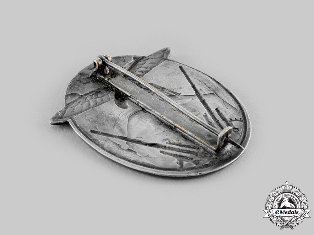 (Flakkampfabzeichen). In nickel silver, die struck, non-magnetic, semi hollow, obverse presenting a detailed eagle clutching a swastika in talons, dual artillery pieces aim upwards, reverse presenting a vertical pin assembly, measuring 42.51 mm (wingtip - wingtip) x 47.84 mm (h), 19.98 grams, worn, very fine.