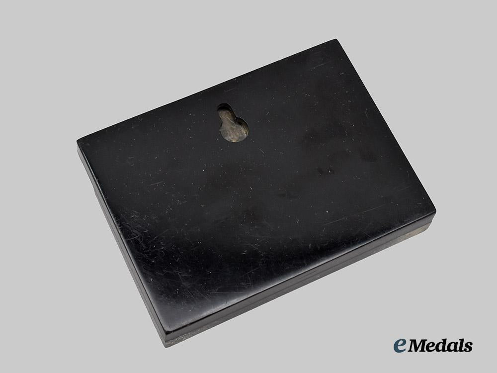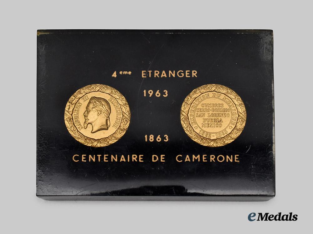 Constructed of a black plastic base, the obverse bearing a two-piece gilded replica of the Commemorative Medal of the Mexican Expedition, surrounded by a gilt dedication from the Foreign Legion for the centenary of the Battle of Camarón (1863-1963), the reverse insert with a suspension hook, unmarked, measuring 10.5 cm (w) x 7.5 cm (h), demonstrating some scratching throughout, a scarce example commemorating a pivotal battle in the history of the French Foreign Legion in near extremely fine condition.
