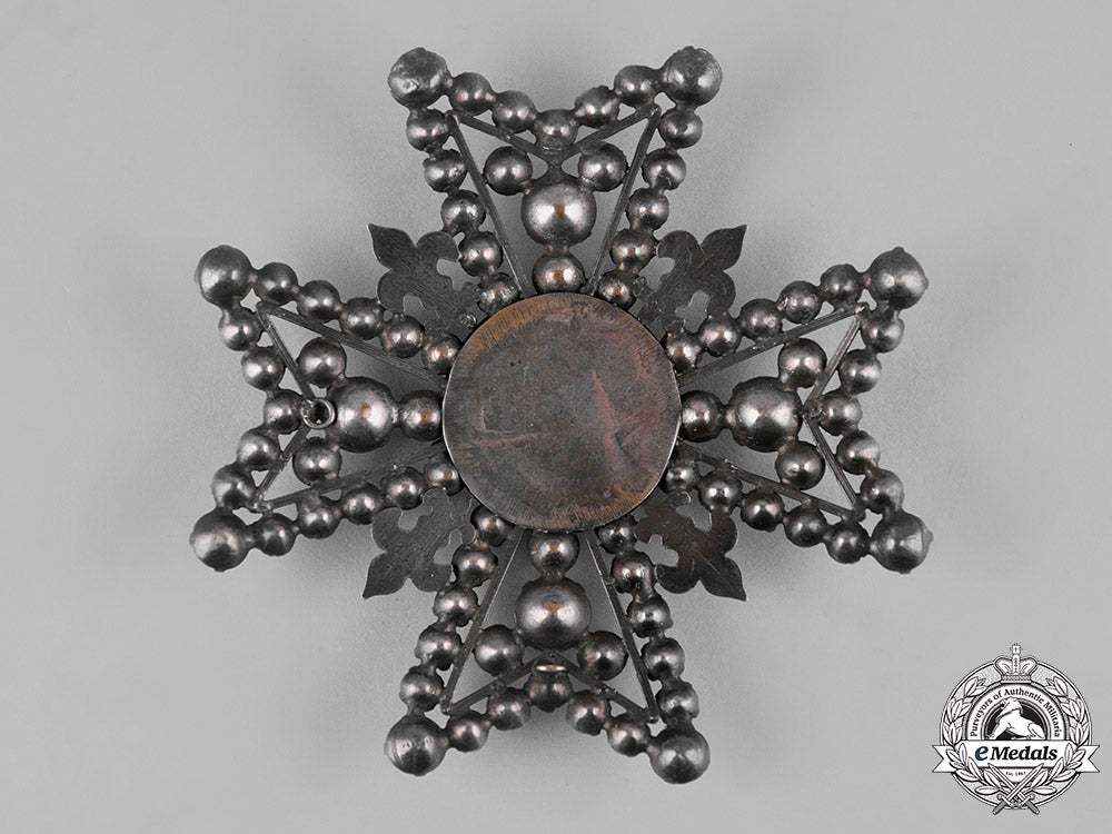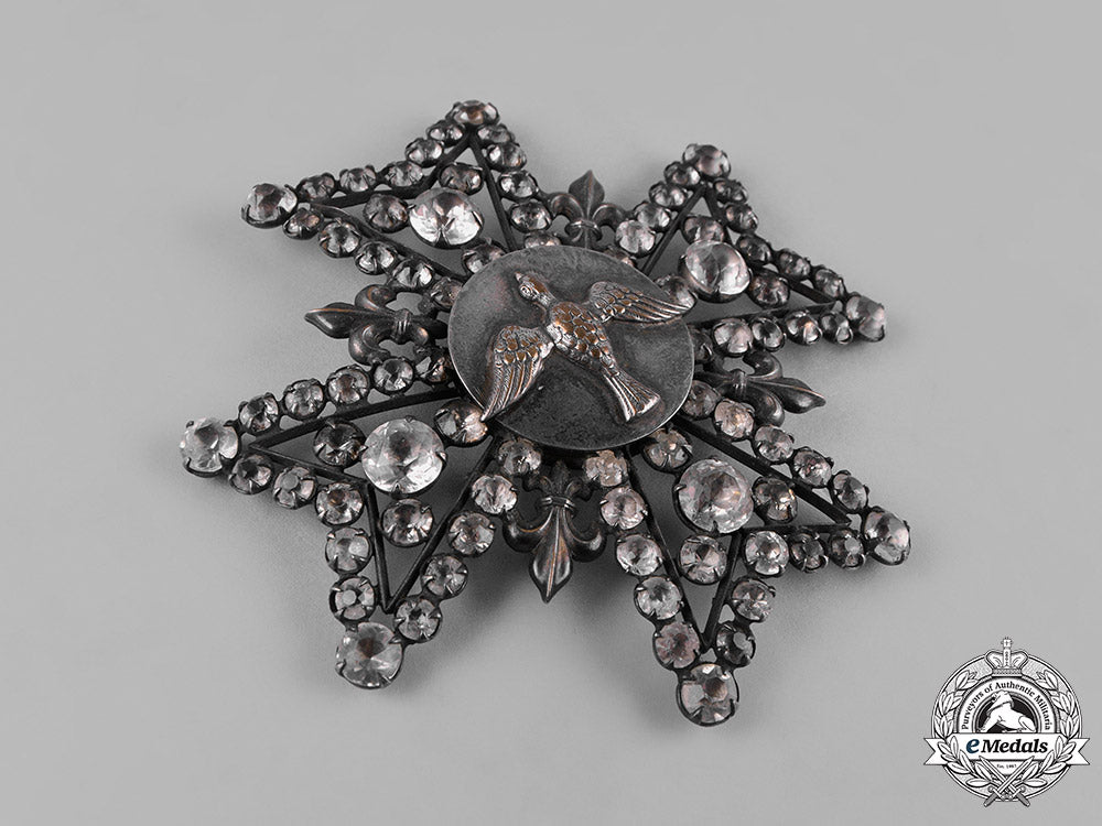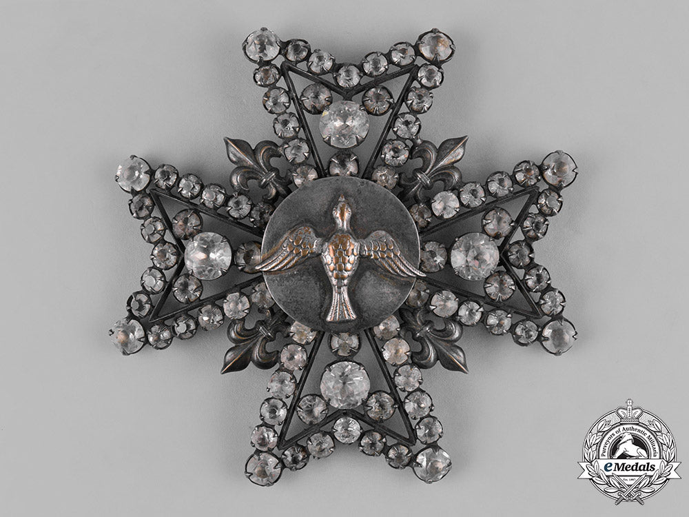 (Ordre du Saint-Esprit). Instituted by Henry III in 1578. Museum Display Piece. A highly rare historical museum-piece, consisting of an unbodied silver frame shaping a Maltese Cross with ball finials, embellishing by clusters of synthetic stones of different sizes on each arm, with delicate silver fleur-de-lys in each quadrant, obverse centre featuring a symbol of the Holy Spirit on a silver plaque, plain reverse with rings for sewing in the uniform, measuring 86.66 mm (w) x 86.53 mm (h), with light contact and toned silver, missing two rings on the reverse, very fine.