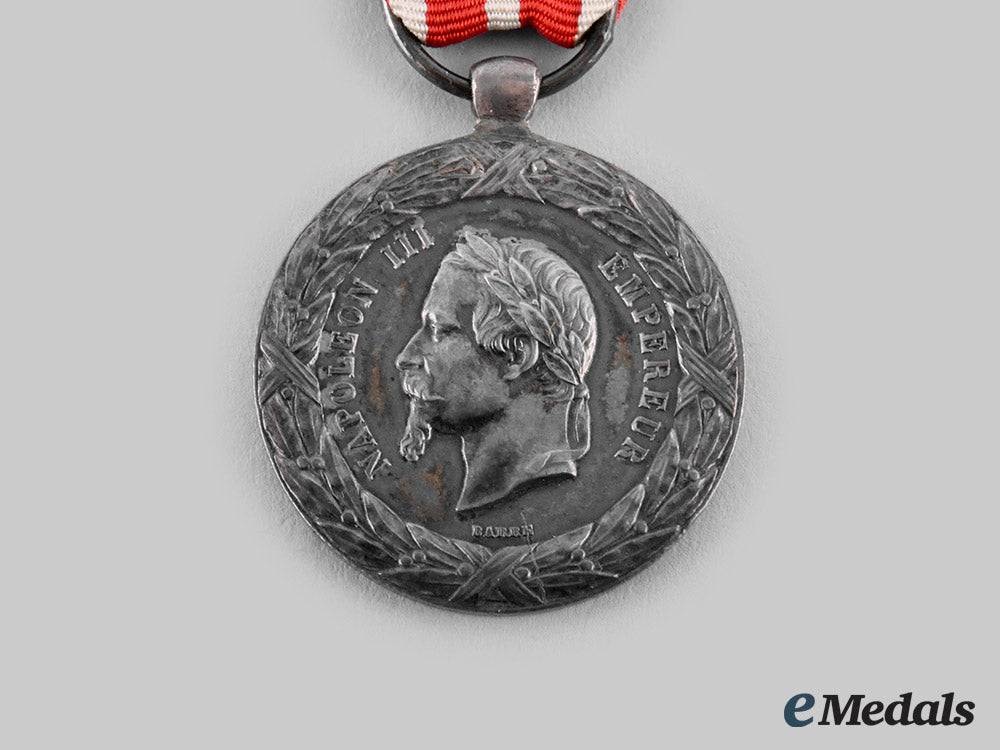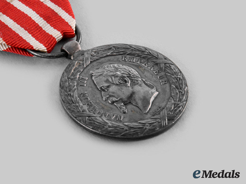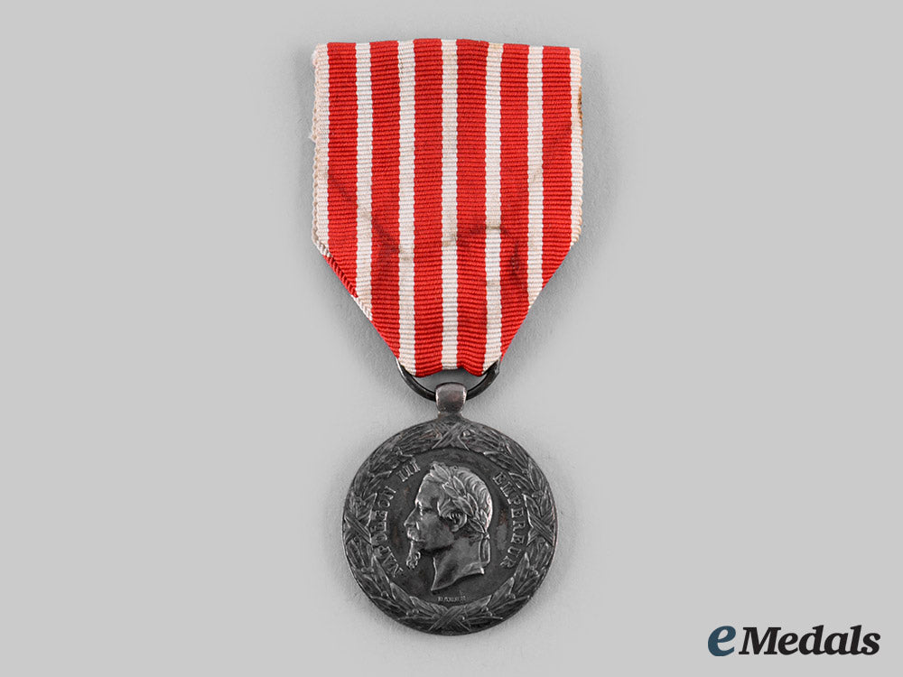 (Médaille commémorative de la campagne d'Italie de 1859). Instituted in 1859. In silver, engraver marked "BARRE" on the obverse, hallmarked on the reverse of the integral suspension, measuring 30.8 mm in diameter, dark patina, very light contact, original ribbon, near extremely fine.