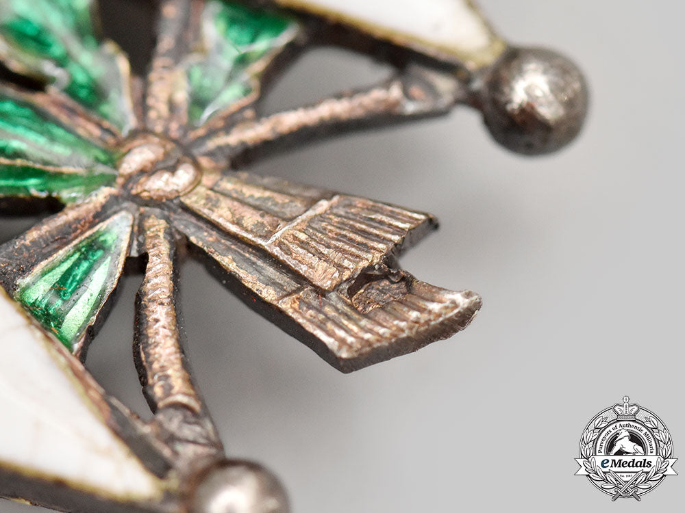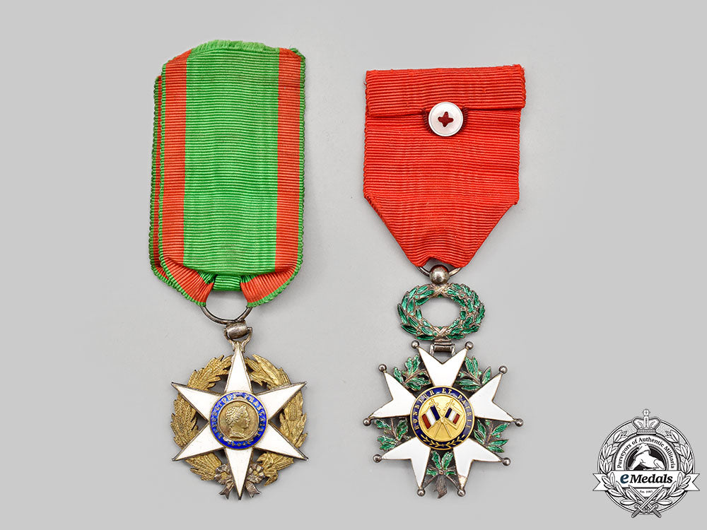 1. Order of the Legion of Honour, V Class Knight (Ordre de la Légion d'Honneur, Chevalier). Instituted in 1802. In silver with blue, white, red and green enamels, both centrepieces in Gold, hallmarked with a boar's head on the tip of the ribbon on the obverse, maker marked "AB & Co" (Arthus Bertrand) on the ring, measuring 40.7 mm (w) x 59.5 mm (h) inclusive of its wreath and laterally-pierced ball suspension, chipping and loss evident in the white enamels in multiple locations on the arms on both sides, original ribbon with white button attachment.