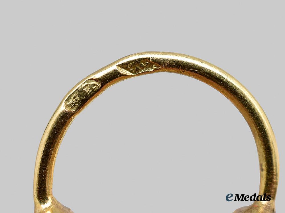 Instituted July 7, 1883. In Gold, a white enamel cross with wreath segments in each quadrant, the medallion featuring a small right facing bust of Marianne encircled by a blue enamel ring, reverse plain, suspended from a ring with five accent old european cut diamonds, measures 11.5mm (w) x 24.4 mm (h - inclusive of integral ring), weighs 1.79 grans, missing ribbon, indecipherable Gold and maker mark on ring, enamel damage to blue ring, otherwise in very fine condition.