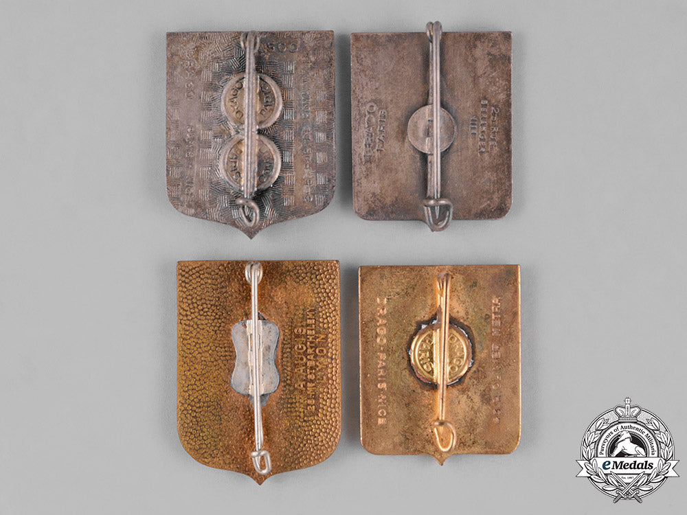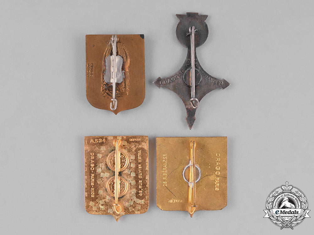 Fifteen are fabricated from bronze, seven of which are silvered, eight are gilt, fourteen with various colours of enamels, four are maker marked ""Drago Paris"", seven are maker marked ""Drago Paris Nice"", one is maker marked ""A. Augis Lyon"", two are unmarked, in various sizes, thirteen with a vertical pinback, two are missing their pinbacks, the 81st Reg. Res. Infantry badge exhibiting chipping in the yellow enamels, the other fourteen badges with intact enamels. The sixteenth badge is aluminum with red, light blue and dark blue enamels and is without attachment, with scratches on the reverse. Ranging from fine to extremely fine.