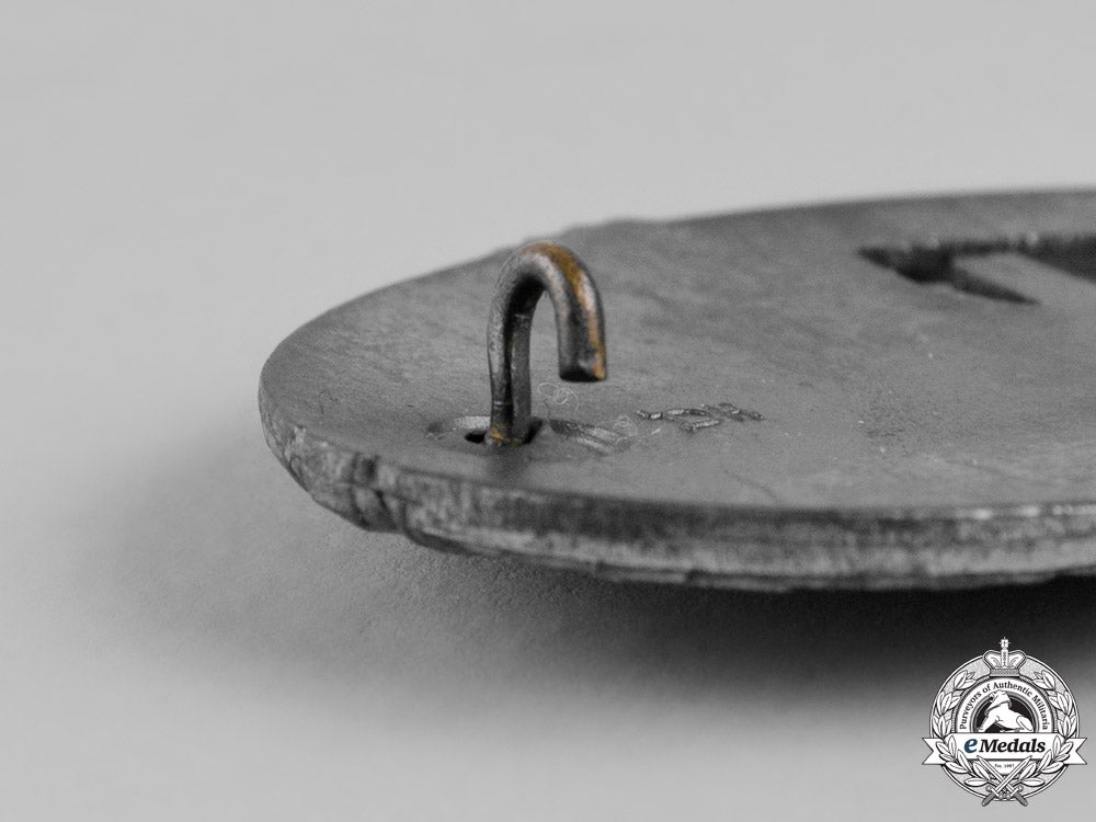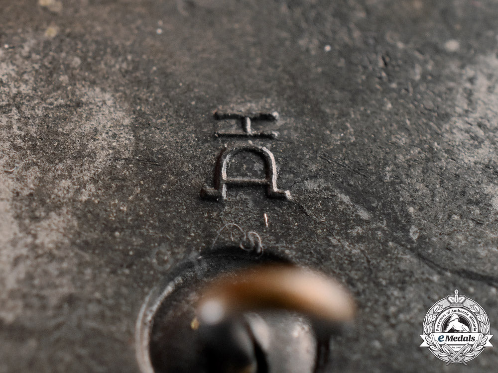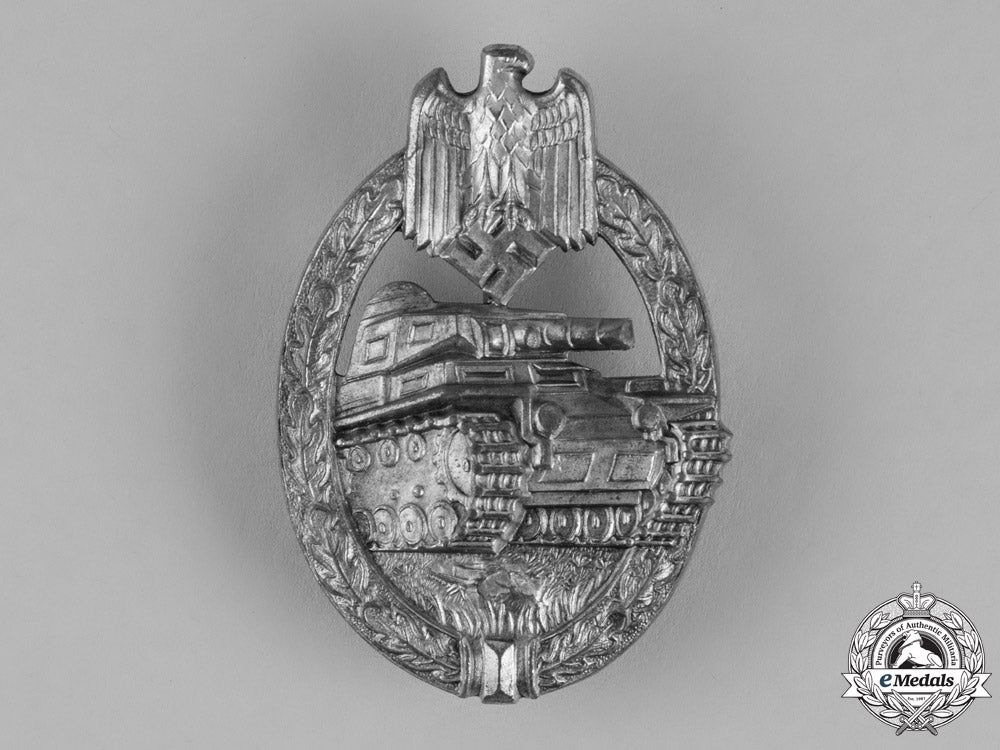 (Panzerkampfabzeichen in Silber). An oval shaped silvered zink; the obverse with a border of oak leaves with a tie at the base and a Panzerkampfwagen IV superimposed in the centre on grassy ground, with its left tank track extending over the edge of the badge; the reverse plain with a vertical needle style pin, a crimped hinge and a crimped round wire catch; maker marked with the stylized logo of “Hermann Aurich, Dresden”; measuring 41.66 mm (w) x 60.11 mm (h); weighing 26.9 grams; in overall extremely fine condition.