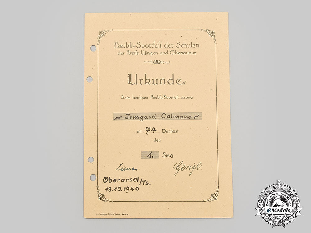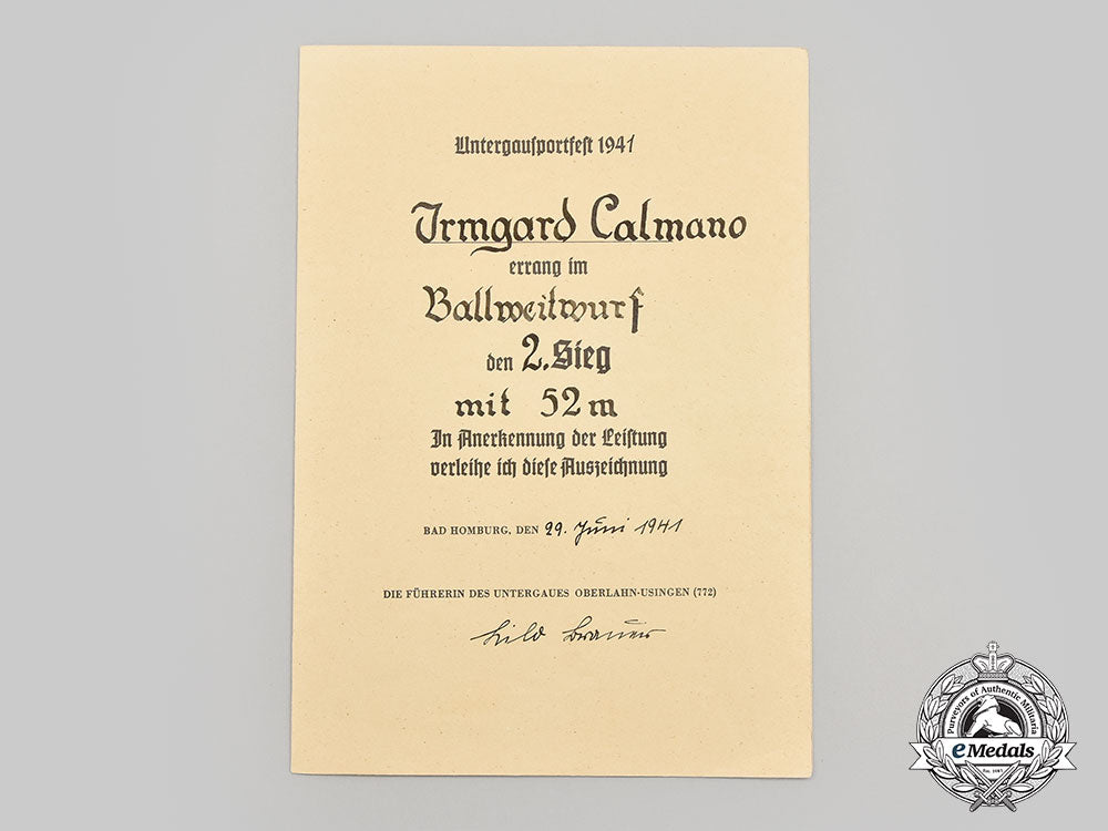 2. A second place victor’s certificate for ball-throwing/shot-put, constructed of beige card stock with black ink, dated 29 June 1941, measuring 15 cm (w) x 21 cm (h), in extremely fine condition.