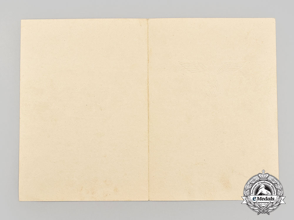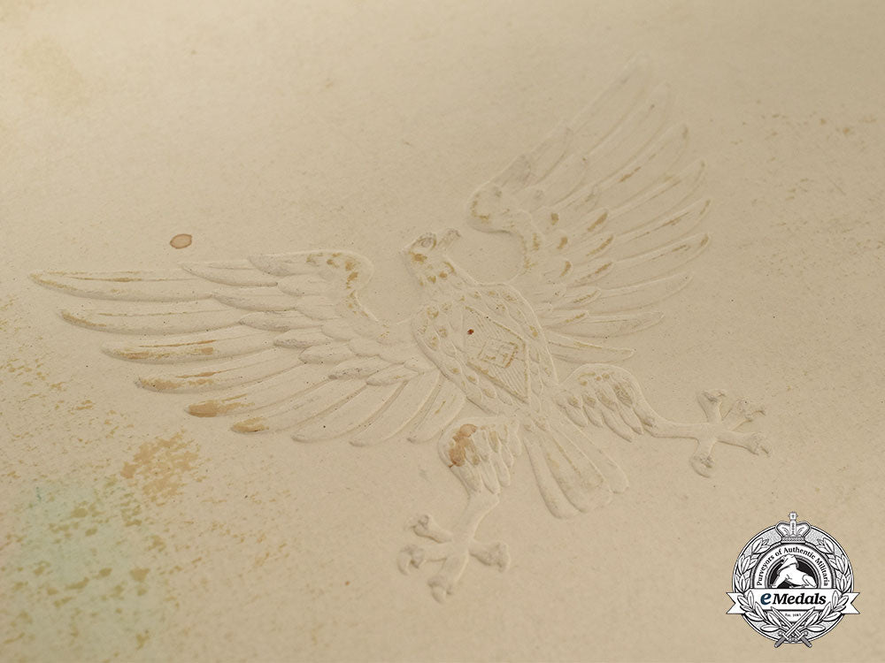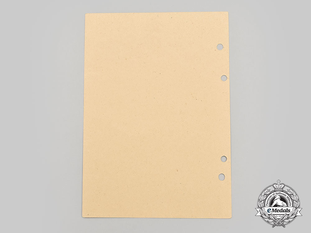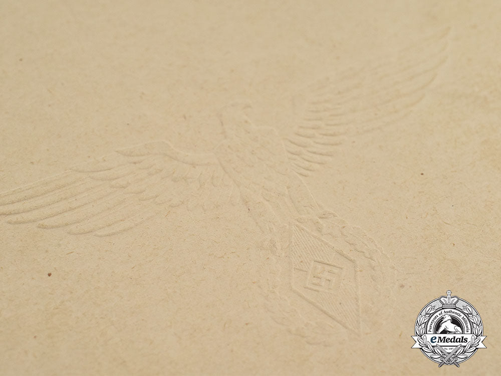 3. A BDM Merit Certificate issued to Calmano as a class-A participant with 1940 cumulative points in organizational sports competitions, issued in Berlin on 1 September 1941, secreted within a period original off-white card stock folio accompanied by a large black-and-white studio portrait of Reichsjugendführer Artur Axmann, measuring 22 cm (w) x 31 cm (h), with minor, age-appropriate discolouration evident, in overall near extremely fine condition.