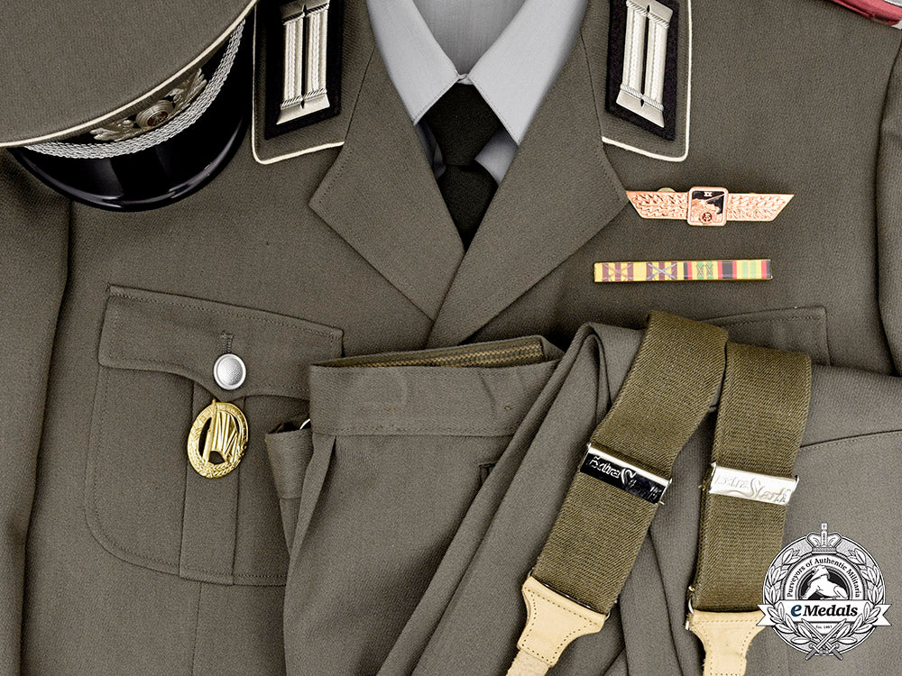 (Nationale Volksarmee Uniform für Hauptmann der Panzertruppe). An extremely well-preserved and complete National People’s Army Panzer Hauptmann dress uniform, consisting of a tunic, dress shirt, trousers, and visor cap.