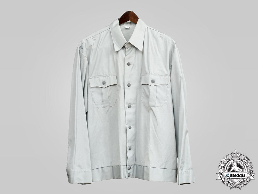 The dress shirt is constructed of blue-grey cotton and features a reinforced collar. Each sleeve has a vertical slit with a single bakelite button meeting a buttonhole for an adjustable fit. A pocket is set onto each breast flap, both closing with pebbled grey zink buttons. The shirt itself closes with seven buttons of identical construction on the right flap meeting an equal number of reinforced buttonholes on the left flap. It is accompanied by an original NVA-issue slate grey cotton tie, as well as by a pair of suspenders constructed of grey cotton with brown leather straps at each end for uniform attachment. The shirt measures approximately 520 mm across the shoulders, with an arm length of 590 mm, and an overall body length of 705 mm. It is in an overall extremely fine condition.