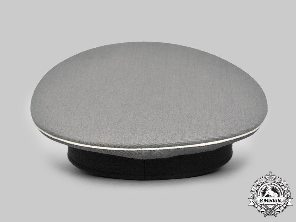 The uniform is accompanied by a cap constructed of grey whipcord wool. It features reinforced side walls, fully lined on the exterior with a dark grey wool cap band. Both the top and bottom edges of the cap band are trimmed with white wool piping, with an additional band of identical piping trimming the outer edge of the crown. Pinned onto the centre of the cap band is a silvered bronze insignia consisting of a central circular NVA insignia within an oak leaf wreath, measuring 75 mm (w) x 45 mm (h). The cap band is flanked on each side by a pebbled magnetic metal button, securing in place a decorative chinstrap constructed of multiple rows of twisted and rolled silver aluminum wire. The chinstrap rests upon a protruding black vulcanfibre visor, securely affixed to the cap with a row of machine stitching. A grey leather sweatband lines the lower edge of the interior, measuring 35 mm in width, while the interior also bears a grey cotton twill liner. A transparent plastic moisture guard is stitched onto the crown, and retains a silvered NVA deport mark. The cap measures approximately 260 mm (w) x 275 mm (l) x 140 mm (h) and is in an extremely fine condition.