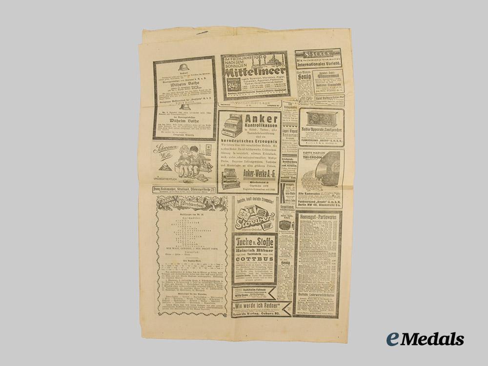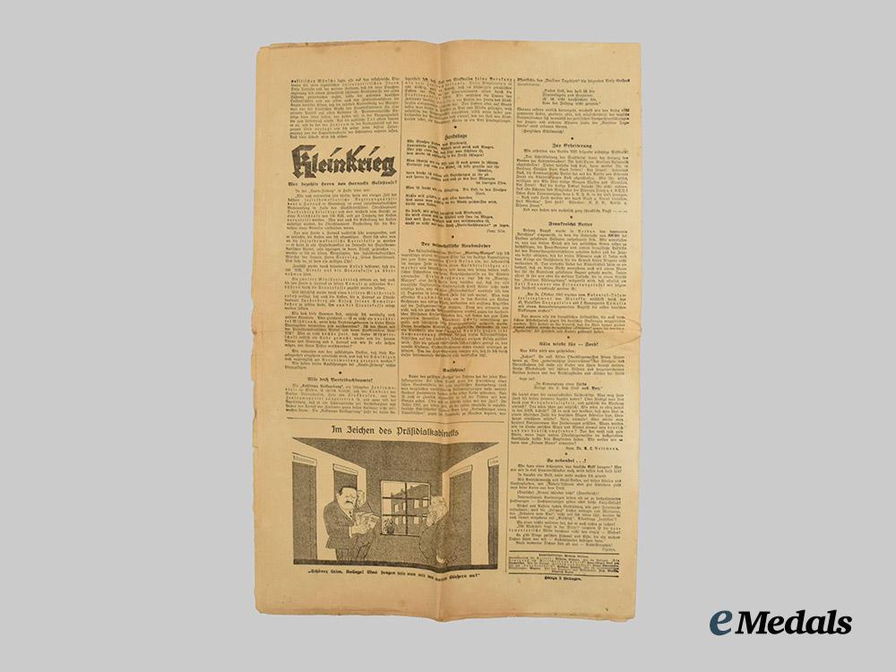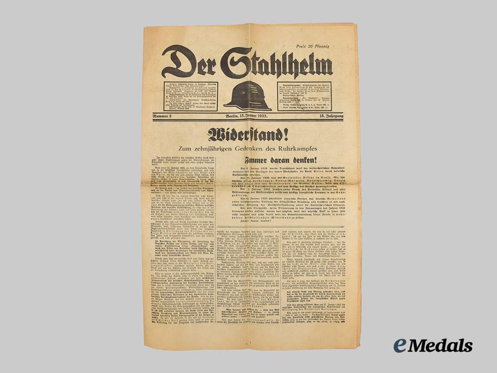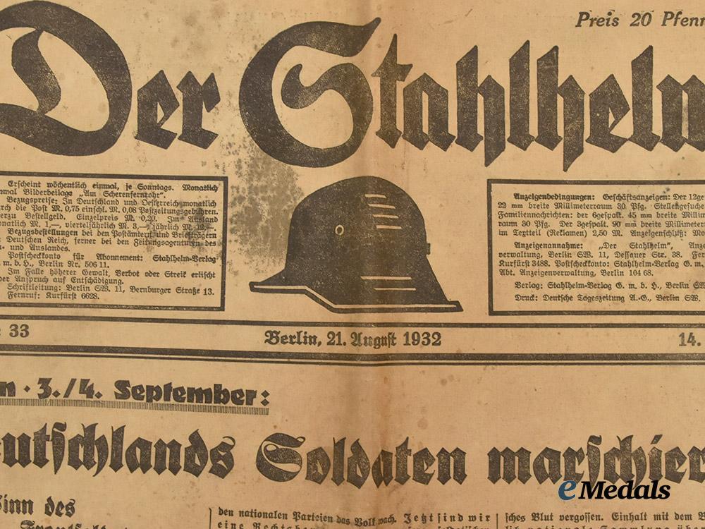 (Der Stahlhelm Papiere). A lot of Stahlhelm paper items, including a 21 August 1932 edition of the Stahlhelm’s official newspaper with all pages intact, demonstrating consistent and age-appropriate material fatigue, in very fine condition; a 15 January 1933 edition of the Stahlhelm’s official newspaper, demonstrating consistent and age-appropriate material fatigue, in very fine condition; a 16 December 1928 edition of the Jungstahlhelm’s official newspaper, with minor material fatigue evident, in near extremely fine condition; a 1928 Stahlhelm newspaper reporting on events in the Soviet Union, with minor material fatigue evident, in near extremely fine condition; a form letter from Reichspräsident Paul von Hindenburg thanking the Stahlhelm for commemorating him at the dedication of a sports facility in Dillenburg, dated 3 August 1933 and closing with a facsimile signature, measuring 210 mm (w) x 296 mm (h), with a central folding crease and some discolouration, in near extremely fine condition, and; a commemorative certificate to Stahlhelm member Joseph Schwerbrock, measuring 175 mm (w) x 250 mm (h) and certified with an embossed organizational seal, in extremely fine condition.