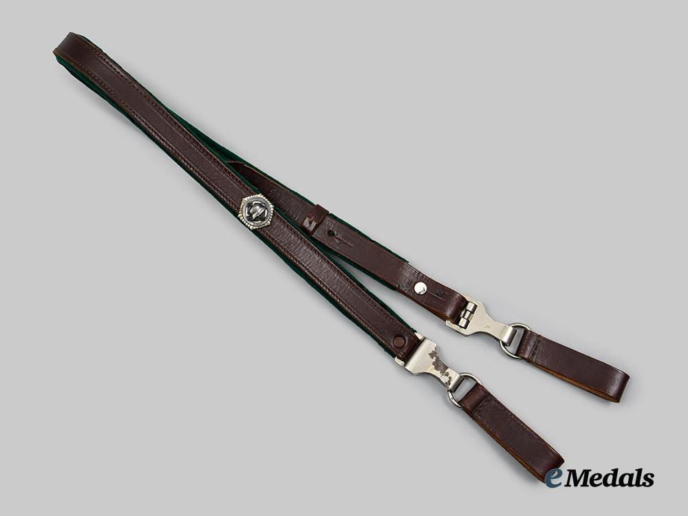 (Der Stahlhelm Hosenträgergurt für Abteilungsleiter). Constructed of brown leather with a dark green wool underlay, with each end fastened into a loop culminating in a functional magnetic metal spring clip, in turn connecting to additional brown leather loops with magnetic metal D-rings, one end perforated with eyelets and bearing an embossed maker’s mark of “DER STAHLHOF, WIRTSCHAFTSABTEILUNG, MAGDEBURG”, the opposite end fastened with a Nationalsozialistischer Deutscher frontkämpfer-Bund - Der Stahlhelm (National Socialist German Combatants’ Federation - Der Stahlhelm (NSDFBSt) badge measuring 25 mm (w) x 28 mm (h), measuring 75 cm (as presented and exclusive of loops) x 2 cm (w) (indicating Abteilungsleiter issue as per the regulations of 1934), demonstrating only minor material fatigue, a scarce and superb example in extremely fine condition.