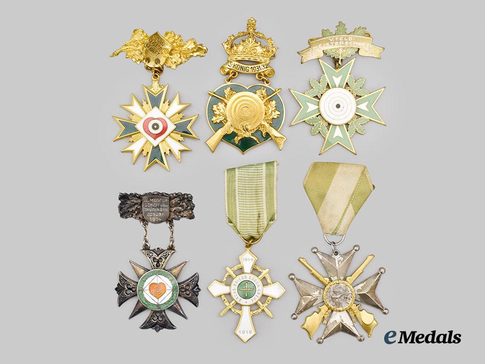 A lot of six Imperial German marksmanship awards, constructed of silver, bronze and enamels, in varying sizes, in fine to very fine condition.