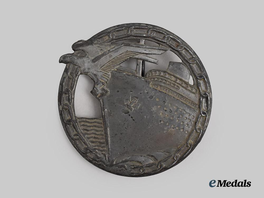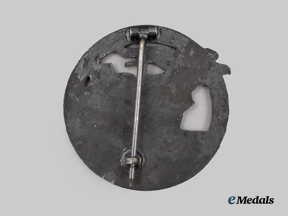 (Abzeichen für Blockadebrecher). Constructed of silvered feinzink, the obverse consisting of a circular chain link wreath, surrounding a central blockade runner cutting through the chain, its bow topped by a German national eagle clutching a mobile swastika while in mid-flight, with its head extending beyond the edge, the reverse with a barrel hinge and vertical pinback meeting a flat wire catch emanating from a circular base, unmarked but demonstrating the physical characteristics of a post-war variant produced by Steinhauer & Lück, Lüdenscheid, measuring 48.89 mm in diameter, weighing 29.5 grams, demonstrating loss of finish throughout, a veteran’s replacement piece or exhibition example produced by a noted wartime manufacturer of Wehrmacht decorations, in very fine condition.