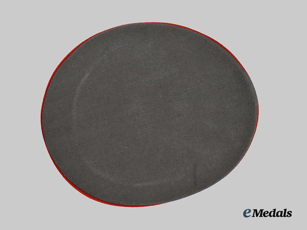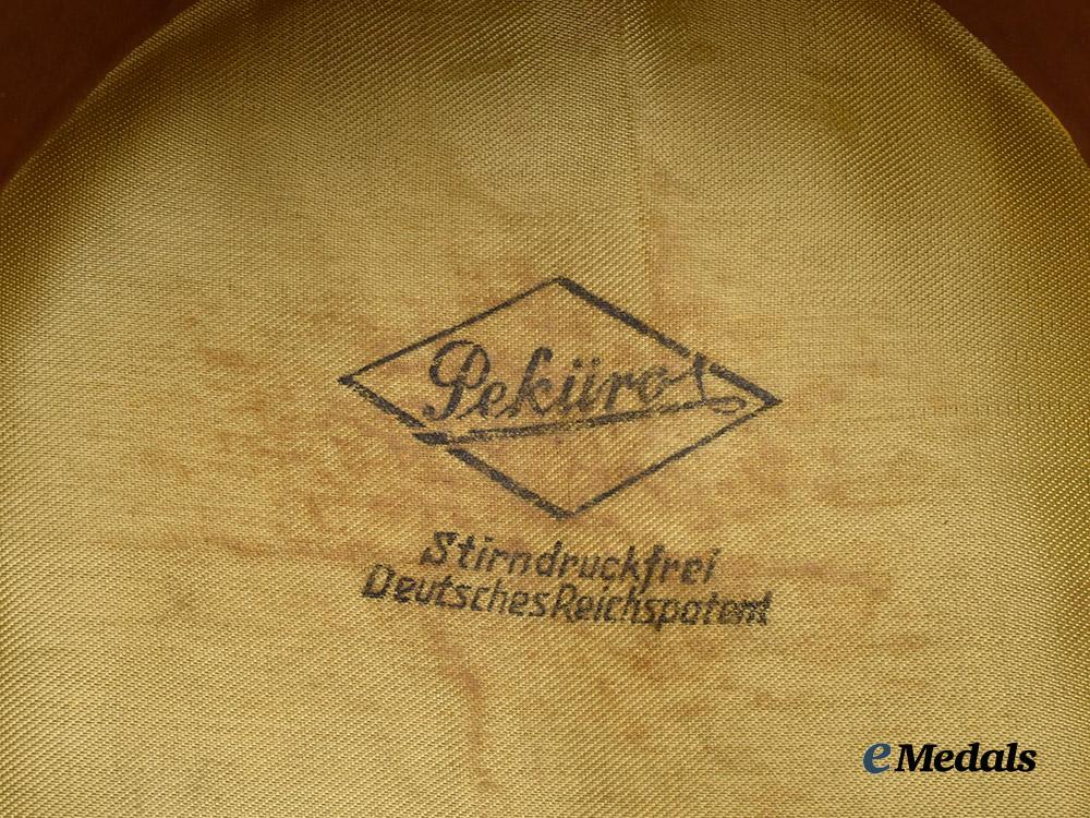 (Heer Schirmmütze für Offiziere der Flak/Artillerie). A well-preserved Heer Flak/Artillery Officer’s visor cap, constructed of field-grey wool with a subtle whipcord weave. It features reinforced side walls which are fully lined on the exterior with a dark green wool cap band. Both the top and bottom edges of the band are trimmed with red wool piping, while an additional length of identical piping surrounds the outer edge of the crown. Stitched onto the peak is an insignia consisting of a dark green wool base bearing a hand-embroidered silver aluminum wire Wehrmacht eagle clutching a wreathed mobile swastika, measuring 70 mm (w) x 25 mm (h). Directly below the eagle, the centre of the cap band features an additional insignia in the form of a dark green wool backer bearing an aluminum tri-colour cockade situated within a silver aluminum wire oak leaf wreath, measuring 78 mm (w) x 45 mm (h). The lower edge of the band is flanked on each side by pebbled aluminum studs which accommodate a chinstrap constructed of multiple rows of twisted and rolled silver aluminum wire. A protruding vulcanfibre visor completes the exterior features, and is finished in black on the obverse and in brown on the reverse. The interior is encompassed by a multi-piece beige rayon liner, while a wide brown leather sweatband surrounds the walls. The crown bears a maker’s mark of “PEKÜRO”, indicating manufacture by the former firm of Peter Küpper, Wuppertal-Ronsdorf. Issues consistent with age and wear are evident, and include some wear to the base metal where the side walls half impact the crown, post-manufacture hand replacement of the eagle insignia with consequent penetration of stitching through the interior liner, and some soiling to the interior liner. The cap remains in a better than very fine condition.