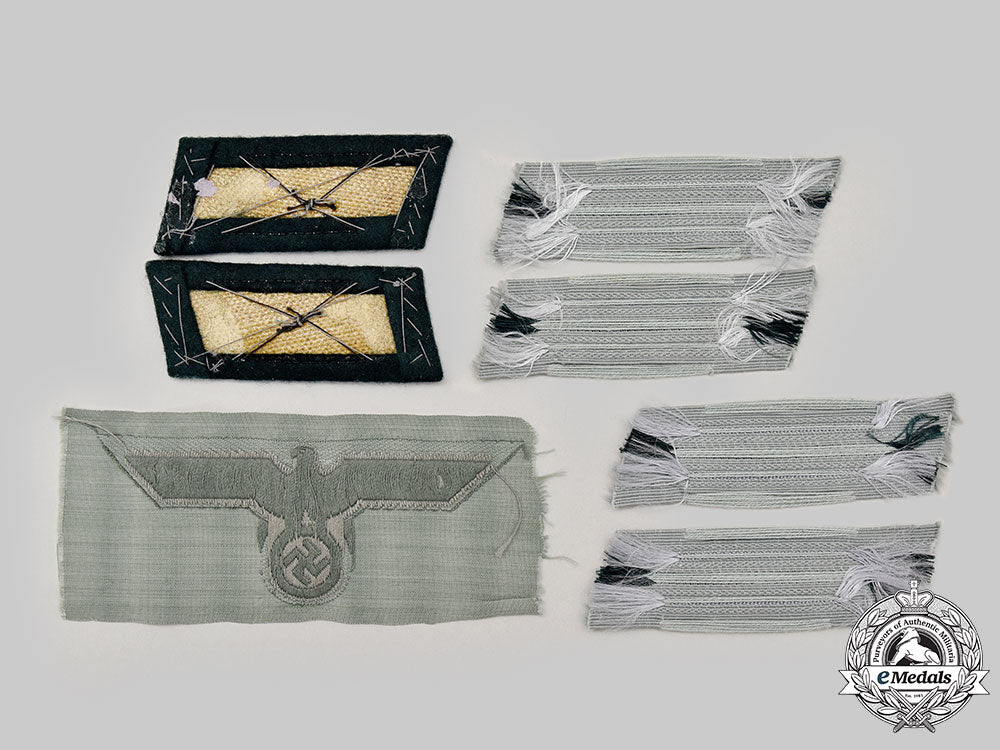 (Heer Insignien). A mixed lot of Heer Enlisted personnel uniform insignia, including a breast eagle, constructed of field-grey rayon, the obverse bearing a machine-embroidered silver-grey Wehrmacht eagle clutching a wreathed mobile swastika, unmarked, measuring 125 mm (w) x 55 mm (h), in unissued and near mint condition; a matching set of Signals collar tabs, each constructed of a dark green wool base with a buckram core and topped by silver-grey insignia bearing lemon-yellow tresses, both unmarked and measuring 30 mm (w) x 70 mm (h), in extremely fine condition, and; a lot of four general issue collar tab insignia, all constructed of field-grey rayon with dark green tresses flanked by silver-grey bands, unmarked and measuring 25 mm (w) x 80 mm (l), in overall extremely fine condition.