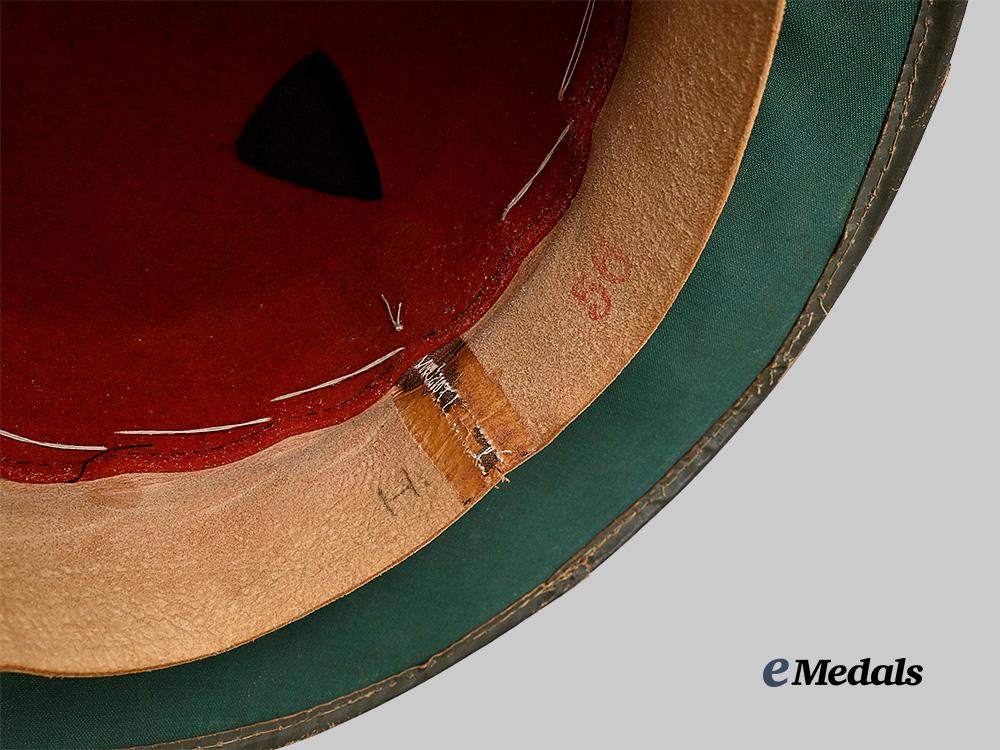 (Heer Tropenhelm - 2. Form). A second pattern Heer tropical pith helmet, constructed of a pressed cork shell which is fully lined on the exterior with olive-drab felt. It features a central canister topped on the crown by a ventilation shaft hidden by a dome lined in identical felt. The canister is flanked by insignia constructed of zink, with the right side featuring a red, white (substituted with silver base metal), and black Wehrmacht tri-colour, and the alloy left side shield consisting of a black shield bearing a raised and silvered Heer-style German national eagle clutching a mobile swastika. Each insignia measures 35 mm (w) x 42 mm (h). A band of olive-drab felt surrounds the lower edge of the canister where it meets a wide brim, itself trimmed along the outer edge with olive-drab leather. A partially-intact slate-grey leather liner surrounds the rim. The interior of the canister is fully encompassed by a dark green cotton liner, and features a scalloped ring which accommodates a light brown leather sweatband. The left side of the rim retains a magnetic metal hook which accommodates a multi-piece slate-grey chinstrap which is adjusted with a functional metal buckle. It completes with a red felt crown which is topped by a gilded brass ventilation fixture. The sweatband folds down to reveal a size mark of “56” and a handwritten letter “H”. Otherwise unmarked, it measures approximately 27.5 cm (w) x 34 cm (l) x 18 cm (h). Minor issues consistent with age and wear are evident, and include some bending throughout the brim, fatigue to the leather of both the rim liner and chinstrap, and oxidation of the crown ventilation fixture. This mid-war helmet remains in a better than very fine condition.