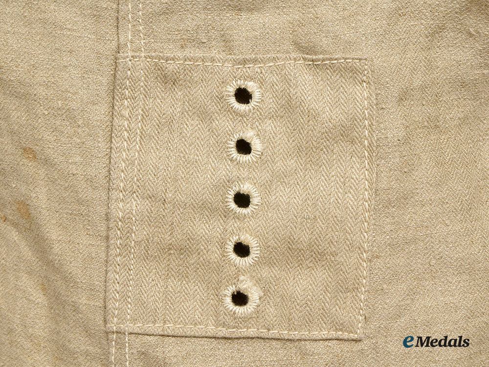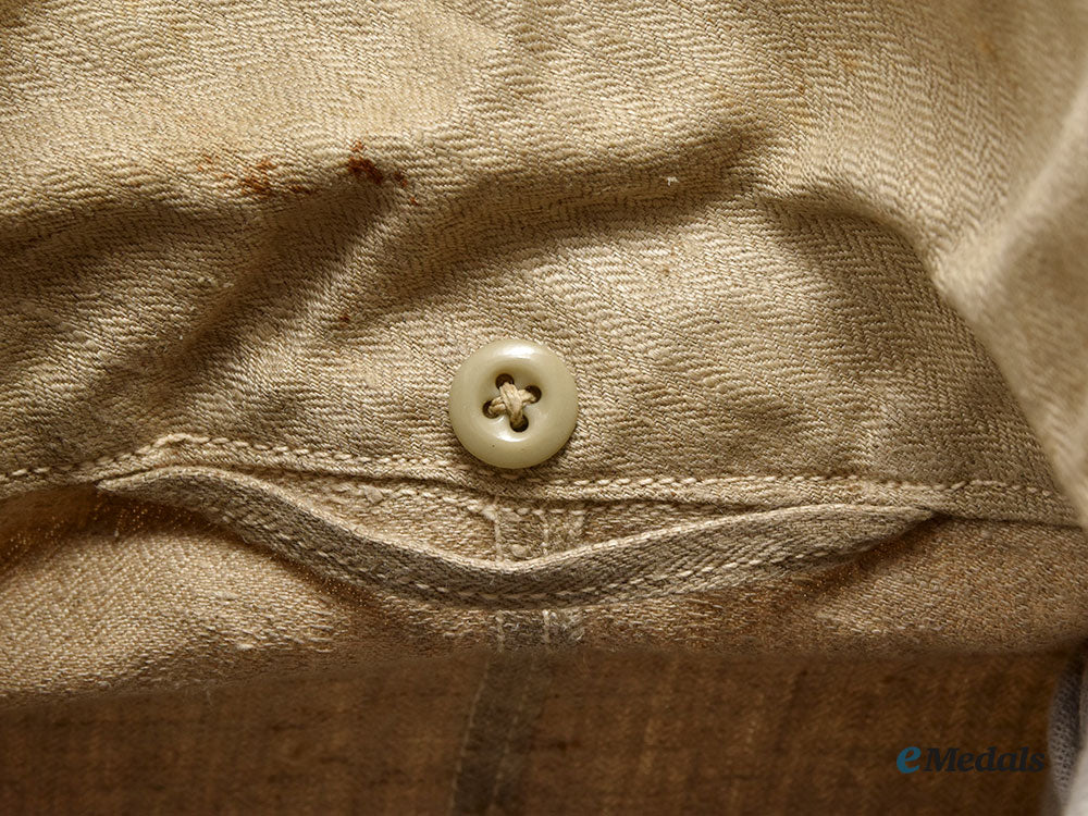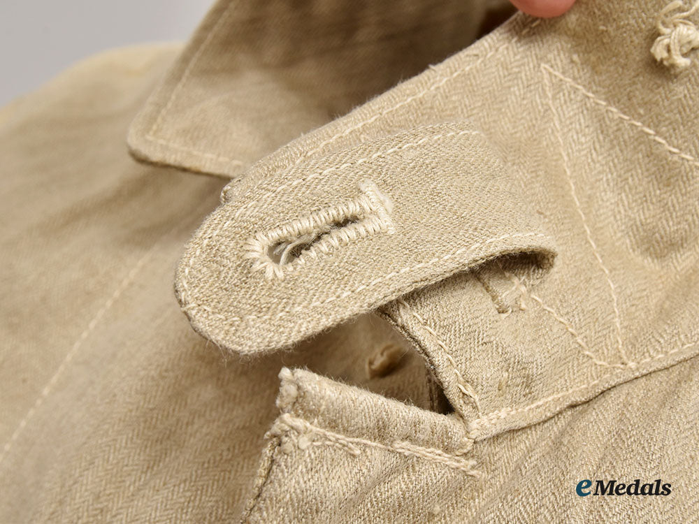 (Wehrmacht Drillich/Arbeitsjacke). An example of a Wehrmacht drill/work jacket, constructed of off-white cotton herringbone twill (HBT). It features a traditional turned-down collar which transitions into double breast lapels. The cuff of each sleeve has a vertical slit that closes shut with two bakelite buttons for an adjustable fit. There is a set of three reinforced eyelets with a slit in each armpit, with an additional five vertical eyelets on both sides at waist height for the optional accommodation of a belt hanger. It closed in the front with five bakelite buttons, which are now missing. The interior is unlined, stamped “45, 44, 90, 68, 67” in black ink on the inside along the left flap. It measures approximately 44 cm across the shoulders (seam to seam), with a sleeve length of 62 cm, and an overall length of 65 cm. Depicting light age appropriate soiling from age, missing the front buttons, in overall near very fine condition.