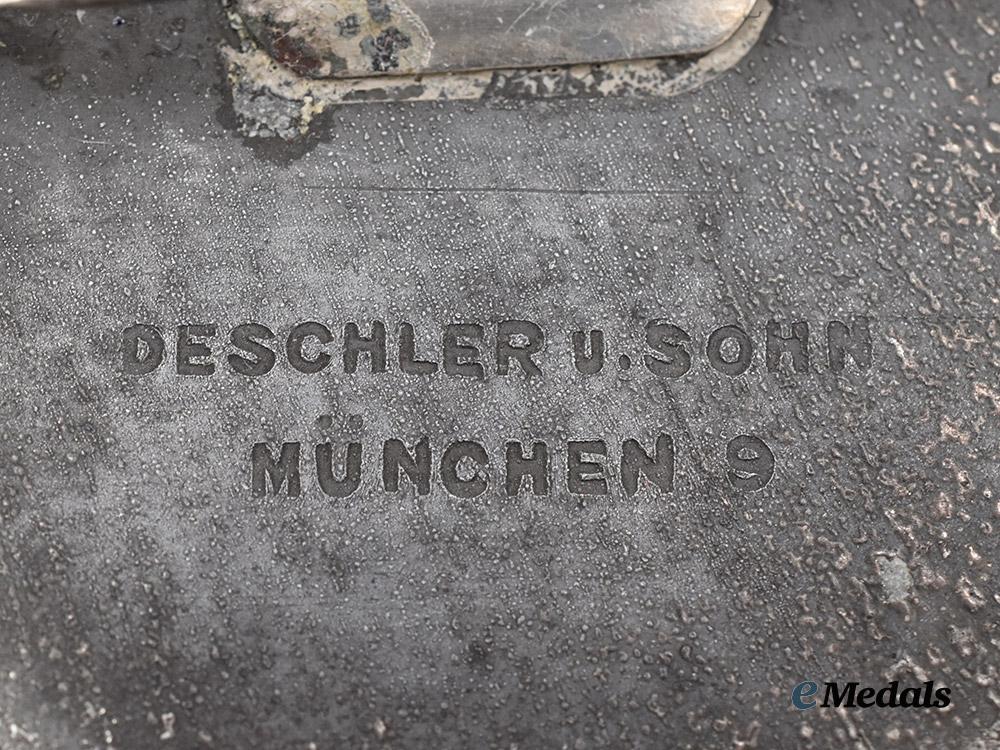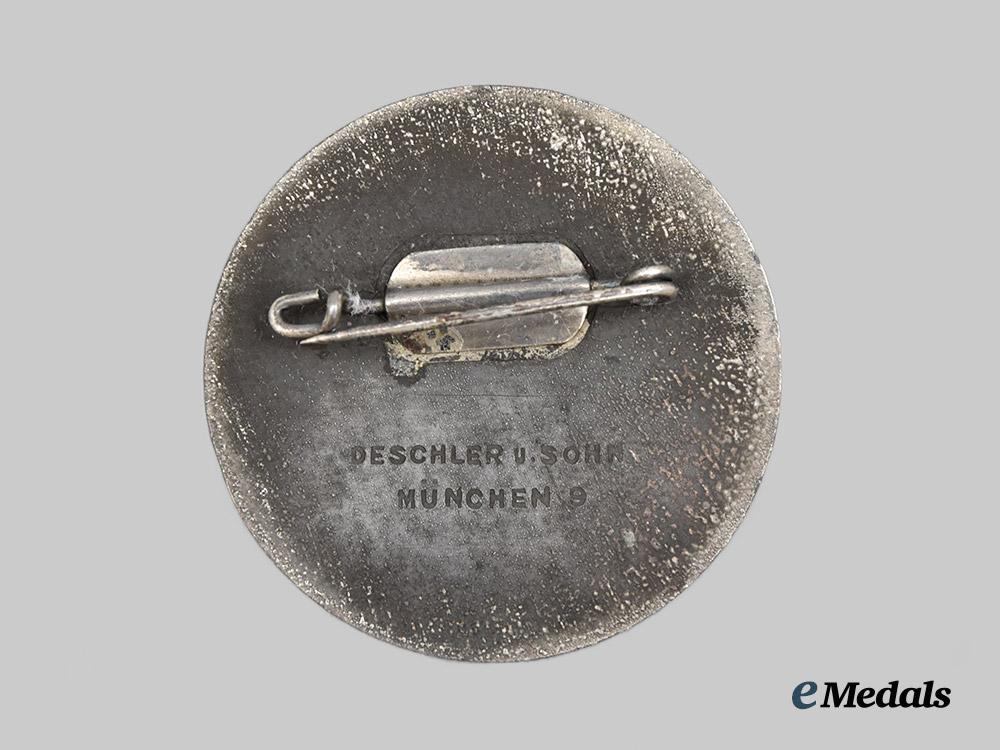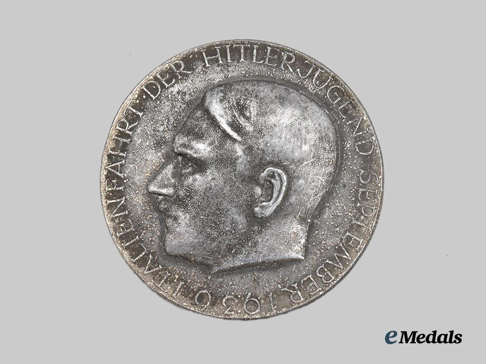 (HJ Erinnerungsabzeichen). Constructed of silvered zink, horizontal pinback, the obverse bearing a raised and leftward-facing profile of AH, circumscribed by an inscription of “ITALIENFAHRT DER HJ SEPTEMBER 1936” (“TRIP TO ITALY OF THE HJ SEPTEMBER 1936”), the reverse make marked “DESCHLER & SOHN, MÜNCHEN”, measuring 40 mm in diameter, demonstrating near-total loss of silver finish throughout, in very fine condition.