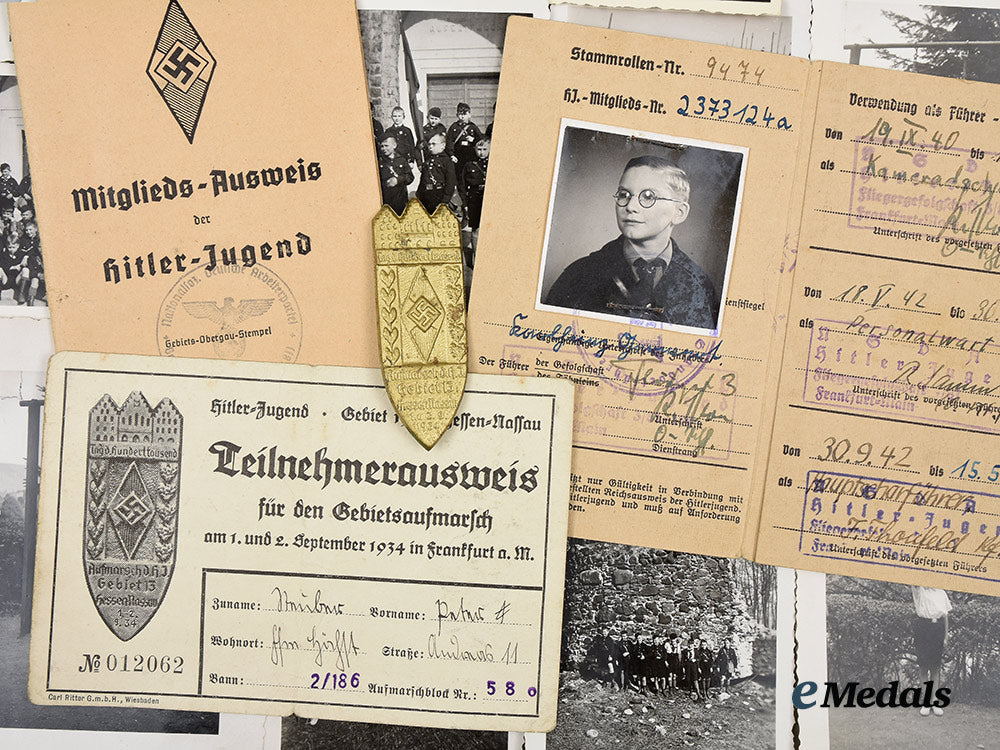 (HJ Ausweispapiere, Fotos, und Auszeichnungen). A mixed lot of HJ paper items and awards, including: