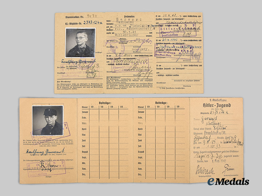 1. A small group named to Karlheinz Gerwert, including a membership booklet, constructed of beige card stock, the interior featuring handwritten entries and retaining a black-and-white photo of Gerwert in an HJ winter uniform, measuring 8 cm (w) x 12.5 cm (h), in extremely fine condition; a Flieger-HJ license, constructed of beige card stock, the interior featuring handwritten and stamped entries, similarly retaining a black-and-white photo of Gerwert in an HJ uniform, measuring 7.5 cm (w) x 12 cm (h), in nea extremely fine condition; supplemented by a group of 13 private black-and-white photos showing Gerwert from entry into the DJ/HJ through the latter part of his service, including depictions with family and members of his unit during activities, a fascinating personalized look at HJ life in extremely fine condition.