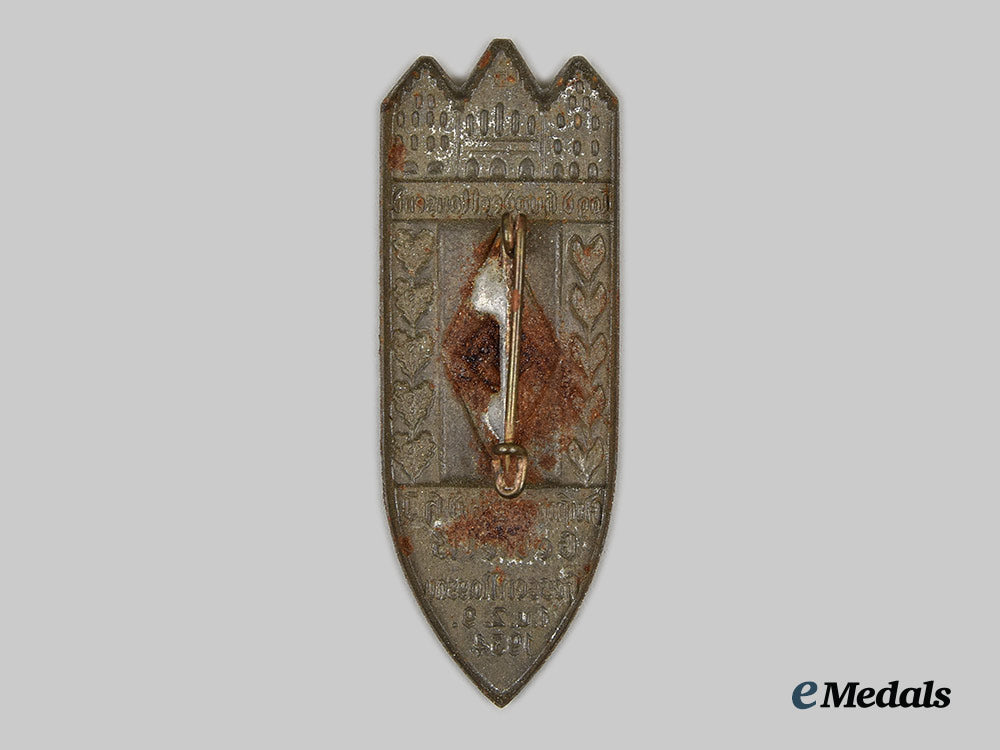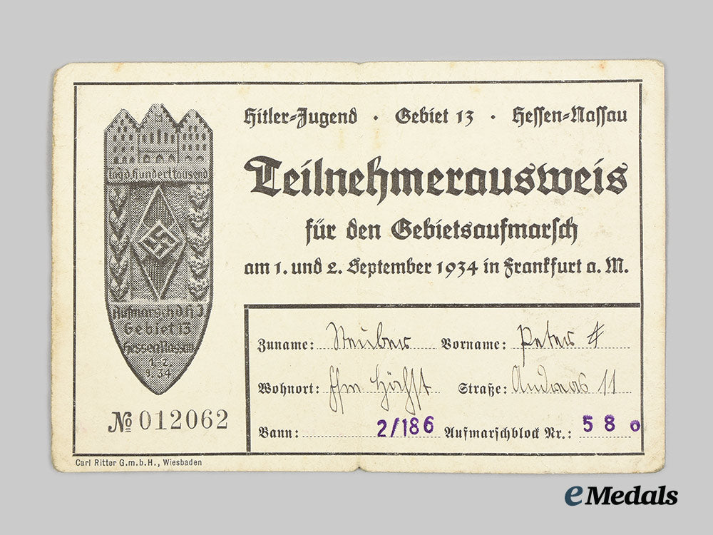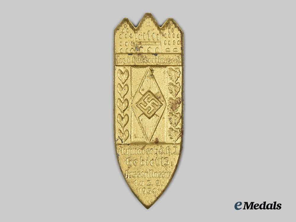 2. A 1934 HJ Hessen-Nassau deployment badge, constructed of gilded magnetic metal, vertical pinback, unmarked, measuring 22 mm (w) x 60 mm (h), in near extremely fine condition; accompanied by a recipient certificate, constructed of card stock with black ink, measuring 12.5 cm (w) x 8.5 cm (h), with some material fatigue evident, in very fine condition.