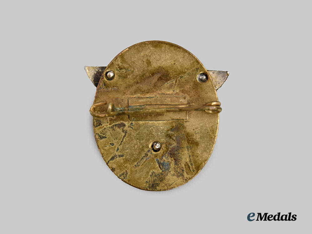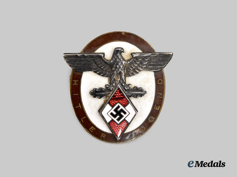 (HJ Ehrenzeichen für verdiente Ausländer). Constructed of gilded and silvered bronze with multi-coloured enamels, the obverse bearing a central oval white enameled medallion, situated within a brown enameled ring bearing a gilt inscription of “HJ”, overlaid by a silvered German national eagle clutching an enameled HJ insignia, flanked by oak leaves, the reverse with three visible rivets securing the obverse applique in position, with a rectangular plate featuring a horizontal pinback, unmarked, measuring 32.44 mm (w) x 33.76 mm (h), weighing 13.0 grams, demonstrating minor flecking and scratching to the enamels with a small chip at the twelve o’clock position, with minor loss of finish to the metal features, a rare distinction in better than very fine condition.