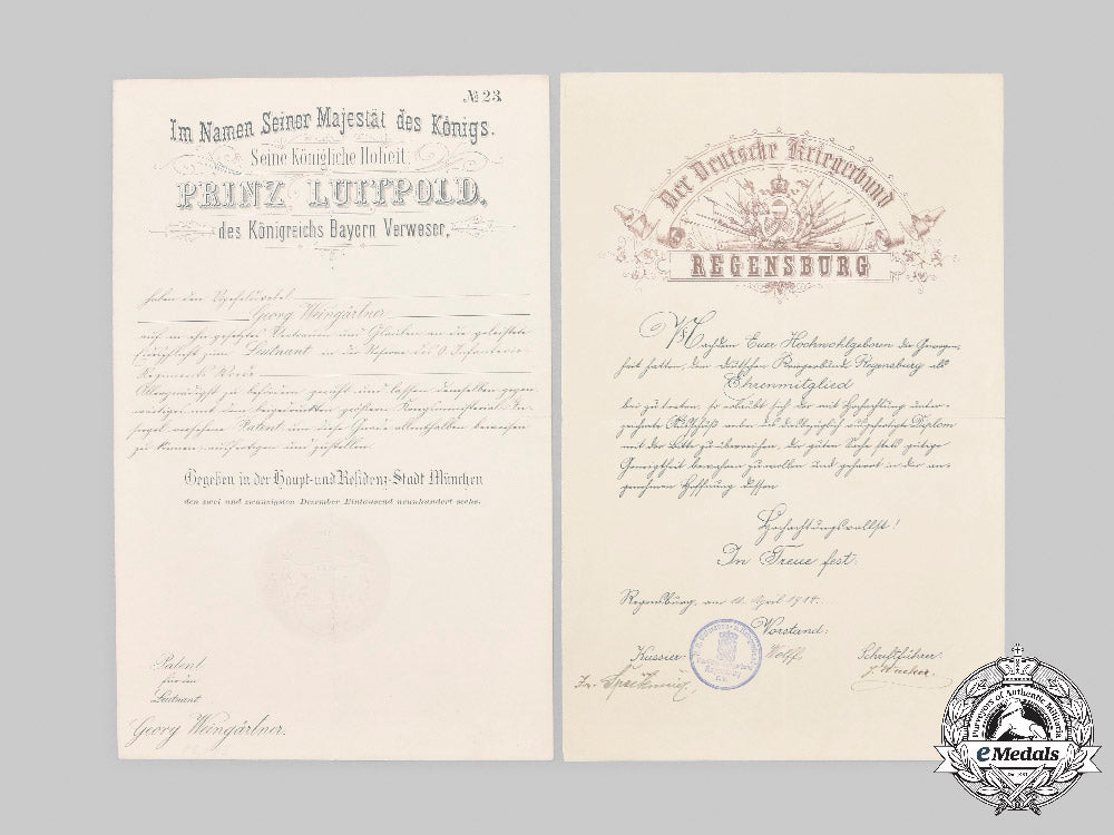 The collection is named to Georg Weingärtner of the Reserve of the 9th Infantry Regiment Wrede in Bavaria. It includes: a promotion certificate to Oberleutnant (first lieutenant); an additional confirmation certificate for the promotion to Oberleutnant; a promotion certificate to Leutnant (second lieutenant); an honorary member certificate in the German Warrior League.