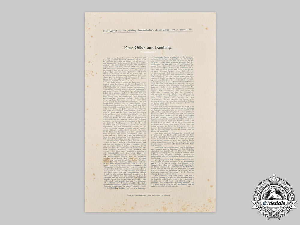 A thirty-nine page photo album, the title page reads “DIE FREIE HANSESTADT HAMBURG UND IHRE UMGEBUNG nach photographischen Aufnahmen von Hof-Photograph Wilhelm Dreesen in Flensburg 37 blatt mit 126 Bildern in Lichtdruck und Titelzeichnung von H. de Bruycker Hamburg VERLAG VON OTTO MEISSNER” (THE FREE HANSESTADT HAMBURG AND ITS ENVIRONMENT after photographs by court photographer Wilhelm Dreesen in Flensburg 37 sheets with 126 pictures in light print and title drawing by H. de Bruycker Hamburg PUBLISHED BY OTTO MEISSNER), the second page bears the table of contents entitled “Verzeichnis der Bilder” (Directory of Pictures), missing the first page of pictures, the photographs depict different areas, buildings and infrastructure of the city of Hamburg, the reverse of the pages are lined with paper to avoid contact with the photographs on the succeeding page, within a brown smooth leather embossed case, the exterior obverse is embossed in gilt letters “DIE FREIE UND HANSESTADT HAMBURG UND IHRE UMGEBUNG” (THE FREE AND HANSESTADT HAMBURG AND ITS ENVIRONMENT), below is a circular image of the city with swans in the water, buildings and a bridge, encompassed by an ornate frame with the Hamburg coat of arms at the top in gilt and red paint, the bottom of the frame is covered by an anchor and a paddle crossed, superimposed over netting, reeds, typha and other foliage, below the centre image is a gilt and paint crowned coat of arms with gilt oak leaf branches on the left and right sides, the exterior reverse is plain, the interior is constructed of ornate coloured paper patterned with a sailing ship with a large sail, with sun rays beaming down encompassed by a border with flowers and two eagles perched eagles looking down over the ship, the interior right bears three flaps of the same ornate coloured paper as a means of holding the pages in the album, the interior back bears an article from the Hamsburg Correspondent reading “Sonder Abdruck aus dem "Hamburg Correspondenten" Mergen-Ausgabe vom 2 october 194 Neue Bilder aus Hamburg”, measuring 370 mm (w) x 517 mm (h), very fine.