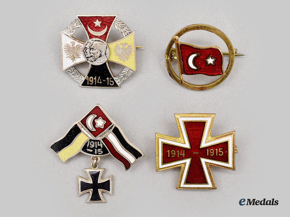 1 A first war year Central Powers badge, constructed of silvered bronze with multi-coloured enamels, consisting of a Cross Pattée with its arms joined through the quadrants by a circular laurel wreath, bearing a central raised medallion overlaid by leftward-facing profiles of Kaiser Wilhelm II and Emperor Franz Joseph, with the arms finished in red, yellow, black, and white enamels overlaid by national emblems and silvered dates “1914-15”, the reverse with a clip hinge and horizontal pinback meeting a round wire catch, unmarked, measuring 22 mm (w) x 22 mm (h), in extremely fine condition.