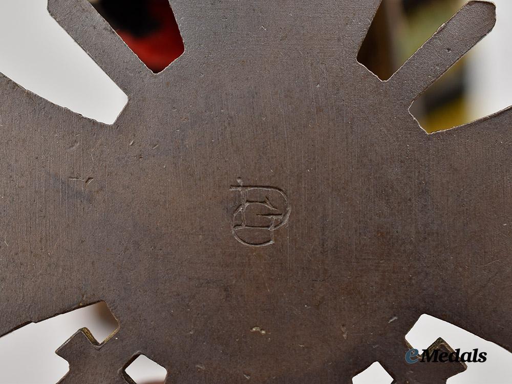 2. An Honour Cross of the World War 1914/1918 for Combatants, constructed of bronzed magnetic metal, on loop for suspension with its period original ribbon, consisting of a Cross Pattée with crossed swords piercing the centrepiece, the obverse bearing central wreathed dates “1914-1918”, the reverse maker marked with the logo of an Gustav Danner, Mühlhausen, measuring 37.92 mm (w) x 42.84 mm (h), in extremely fine condition.