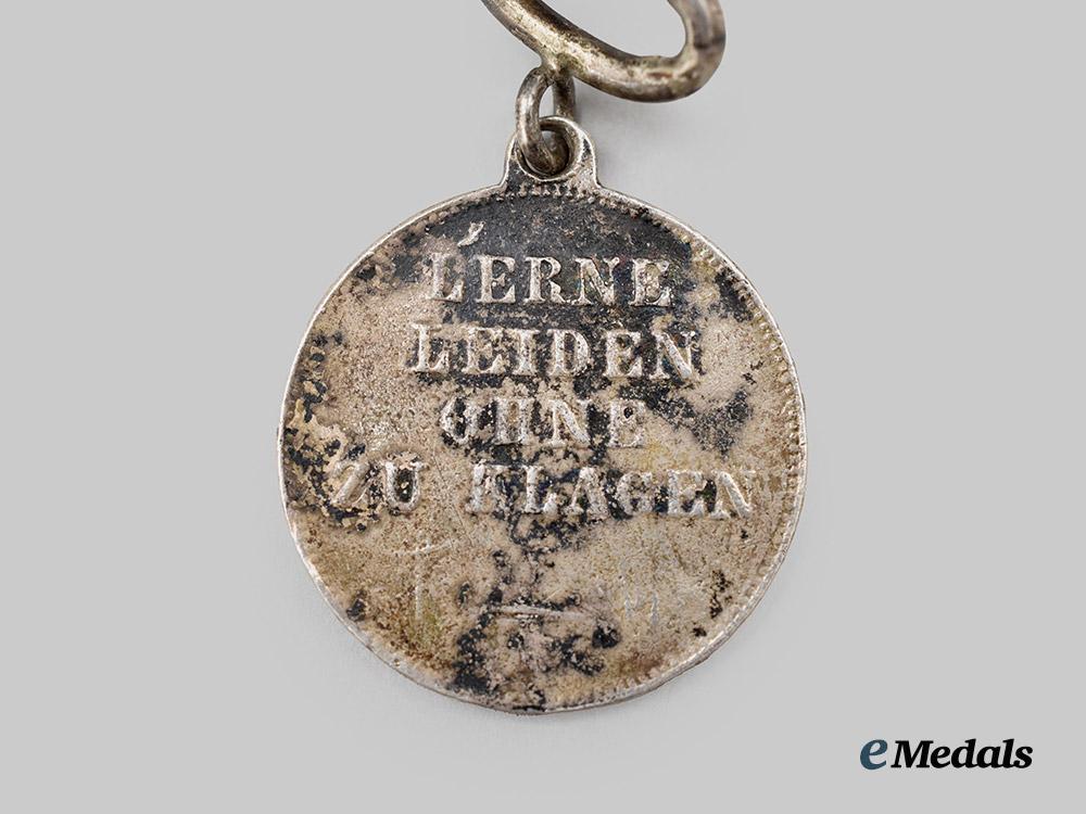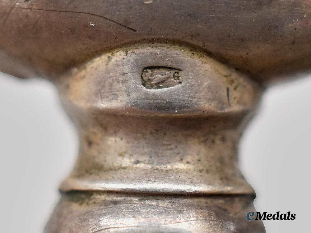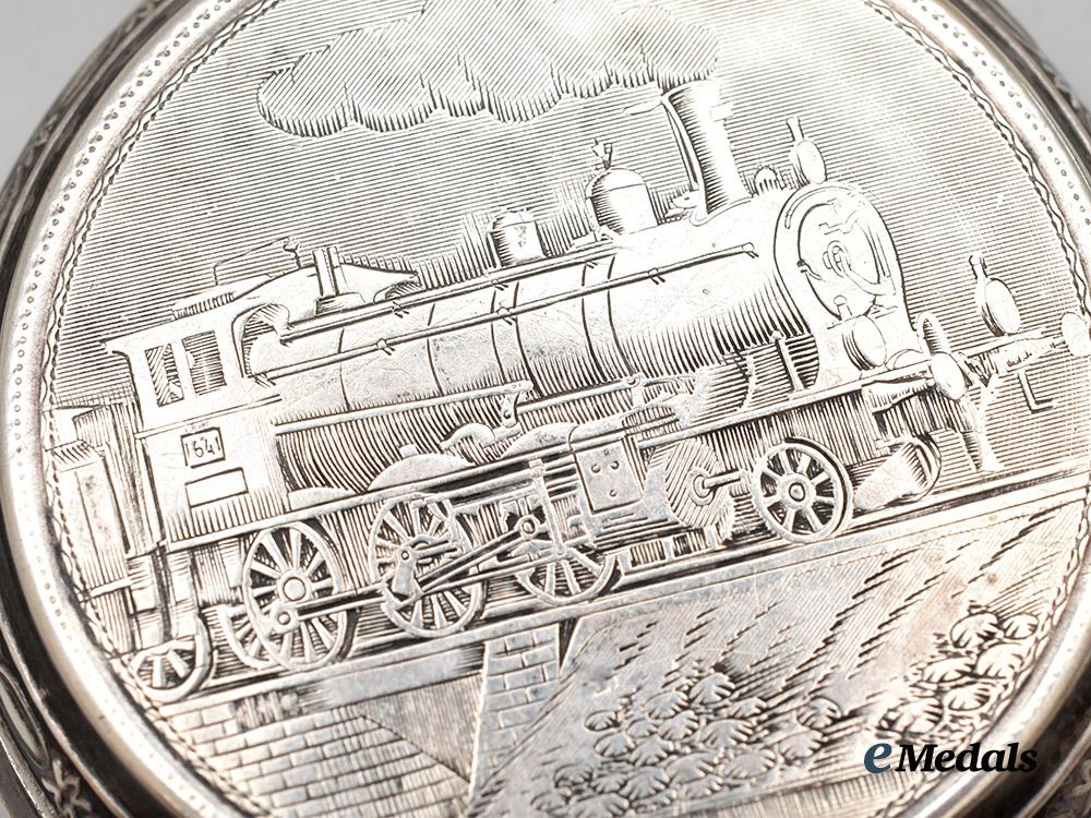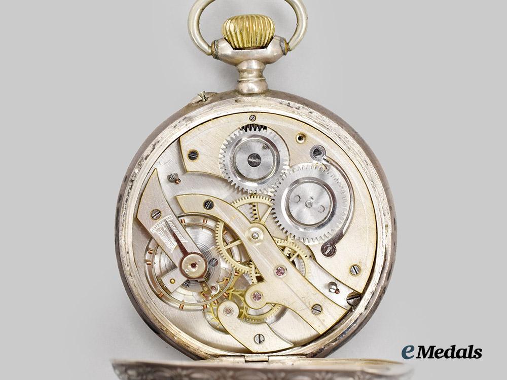 (Taschenuhr). Constructed of a multi-piece silver casing, the obverse featuring a white face with numerals 1-12 graded at five second intervals, in turn topped by 60-second stopwatch markers marked at five second intervals, with gilded hour and minute hands, featuring an additional 60-second stopwatch with an independently-functioning arm, the reverse bearing a finely-engraved depiction of a steam engine, topped by a wind-up dials turn connecting to a non-magnetic metal chain featuring four silver hangers for Franco-Prussian War and distinguished service, the watch opening to reveal mechanisms, a crown and crescent moon indicating German manufacture, a silver content number of “0,800”, and the hallmark of Eugen Porcher, measuring 62 mm in total diameter, demonstrating a consistent patina to the silver and the loss of the back cover’s lock, of indeterminate functionality, in very fine condition.
