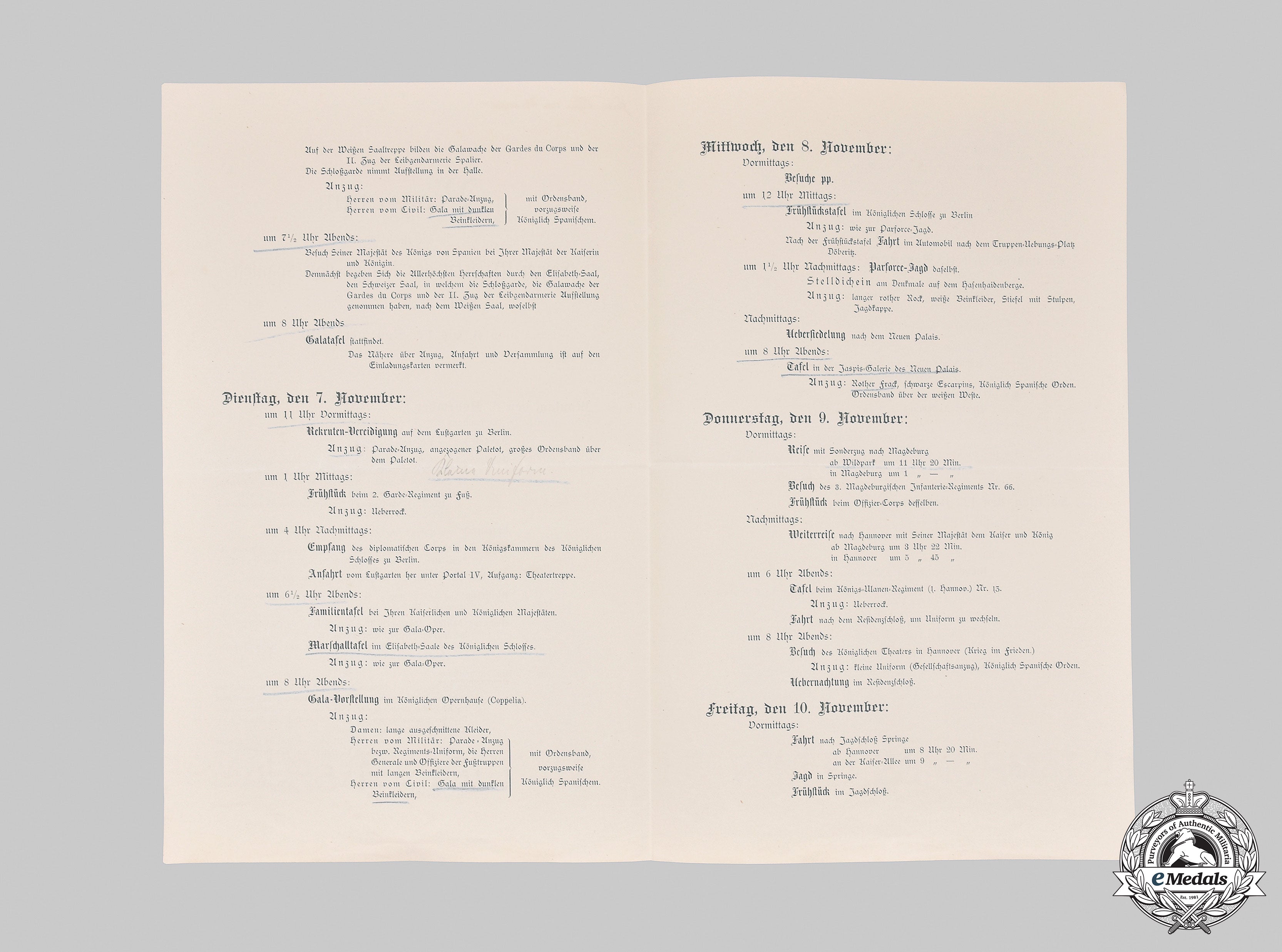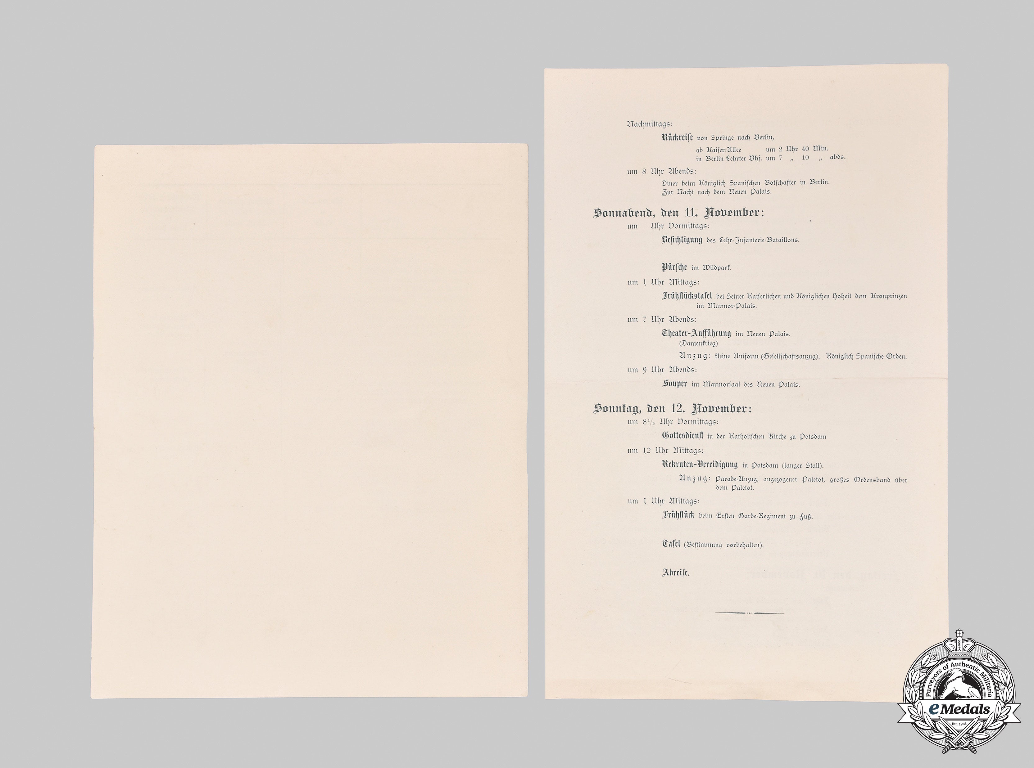 The program details the activities planned for the visit of the King of Spain in Berlin from November 6 to 12, 1905. Measuring 209 mm (w) x 330 mm (h), presenting a folding crease and light creasing of the edges, remains extremely fine.