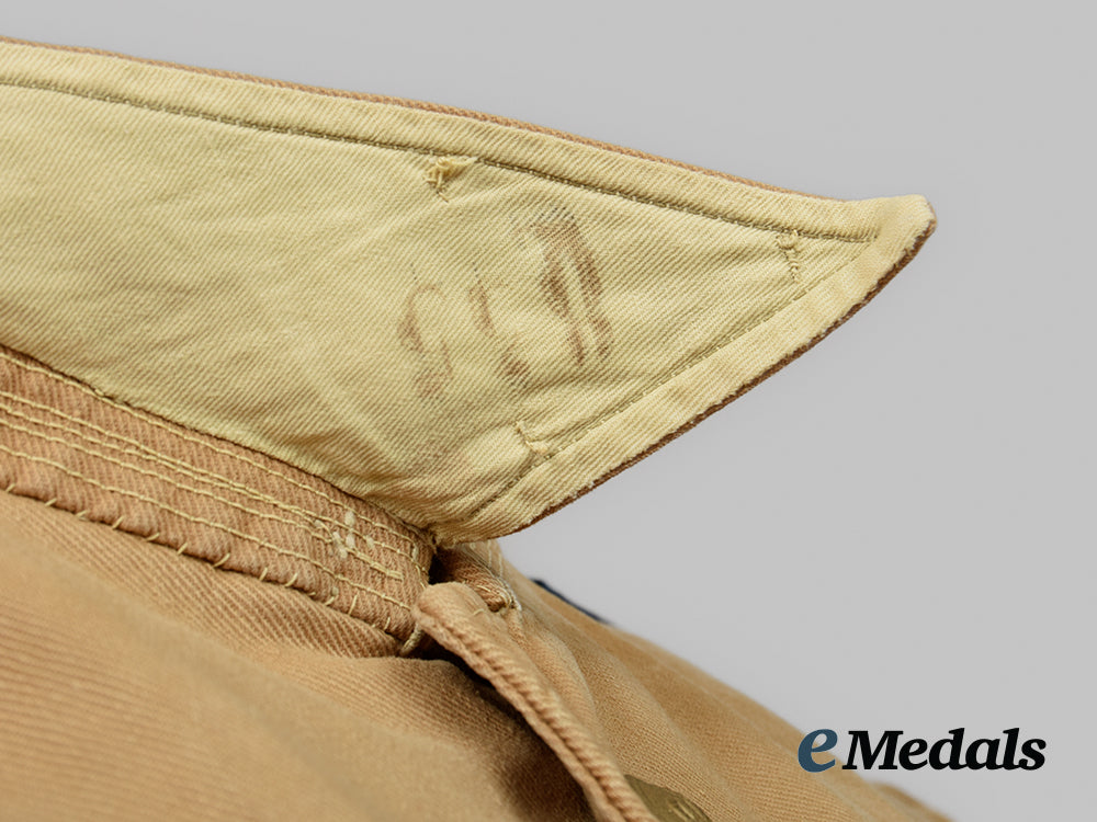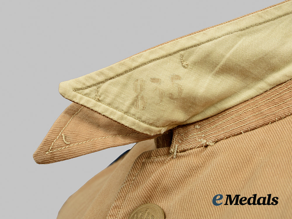 (Ein Uniformrock für einen Offizier-Stellvertreter der Kolonie Schutztruppe). A rare example of an extremely well preserved tropical uniform tunic belonging to an Officer Deputy of the German Imperial Colonial Forces. This tunic shirt is constructed of rugged cotton twill, featuring a traditional turned-down collar that transitions into breast flaps. Each flap has a horizontal-slit breast pocket and a horizontal-slit waist pocket, all secured shut via a scalloped flap and a single button that bears the royal crown. The collar has three loops in a triangular formation for the attachment of collar tabs. The collar itself is flanked on both sides by sew-on style shoulder boards. The boards are constructed of a buckram core, with a blue wool topper, and with two strips of silver aluminum bullion tresse. Each board has the number “2” unit cipher affixed to it, and is affixed to the tunic via a single matching gilded button, measuring 40 mm (w) x 108 mm (h). Both flaps are secured shut in the front via a series of seven vertically oriented matching buttons, that are met by an equal number of reinforced buttonholes on the opposing side. The inside of the tunic is completely unlined, with the sleeves rolled up to form a cuff. It measures 38 cm across the shoulders (seam to seam), with a sleeve length of 60 cm, and an overall length of 84 cm. An example that is rare in this condition, with only light fatigue to the material from age and wear, in overall extremely fine condition.
