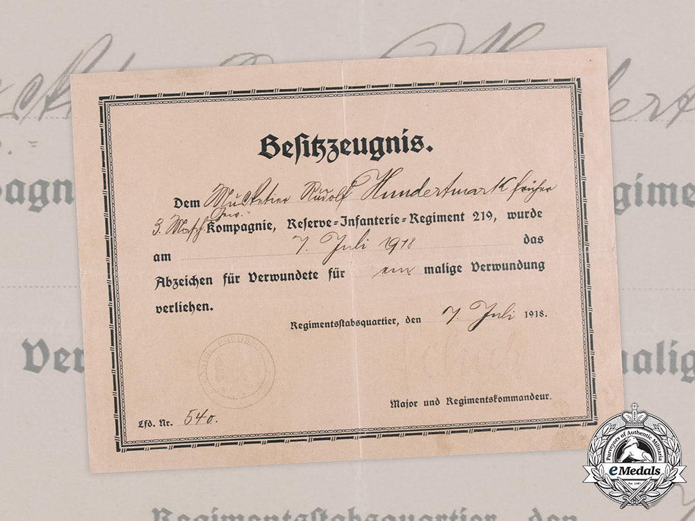 Germany, Imperial. A Wound Badge In Black Certificate To Musketeer Hundertmark, 1918