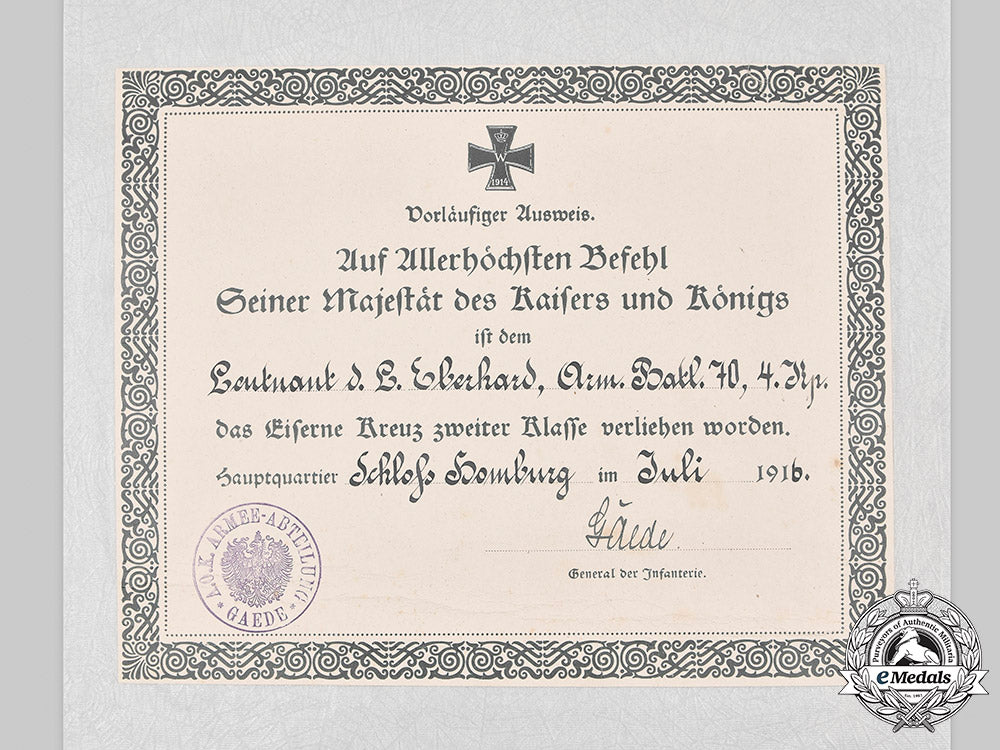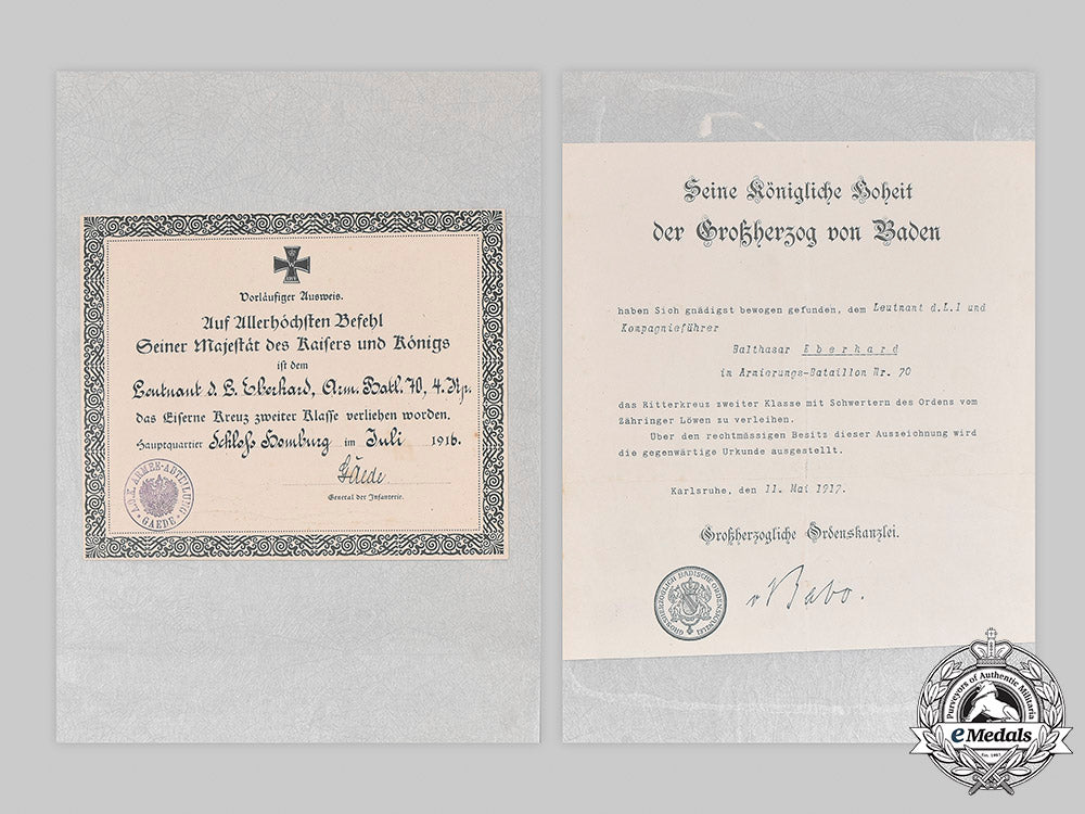 Germany, Imperial. Two First War Award Documents To Leutnant Eberhard (Zähringer Lion)