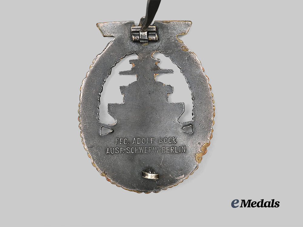 (Flottenkriegsabzeichen). Constructed of gilded and silvered tombak, the obverse consisting of an oval oak leaf wreath, joined together at the bottom by ribbon, topped by a Kriegsmarine eagle clutching a mobile swastika, the reverse with a block hinge and banjo-style pinback meeting a flat wire catch, designer marked “ADOLF BOCK” and maker marked “SCHWERIN, BERLIN”, using the latter’s Variation 2 design, measuring 44.0 mm (w) x 57.1 mm (h), weighing 32.35 grams, in worn, fine condition.