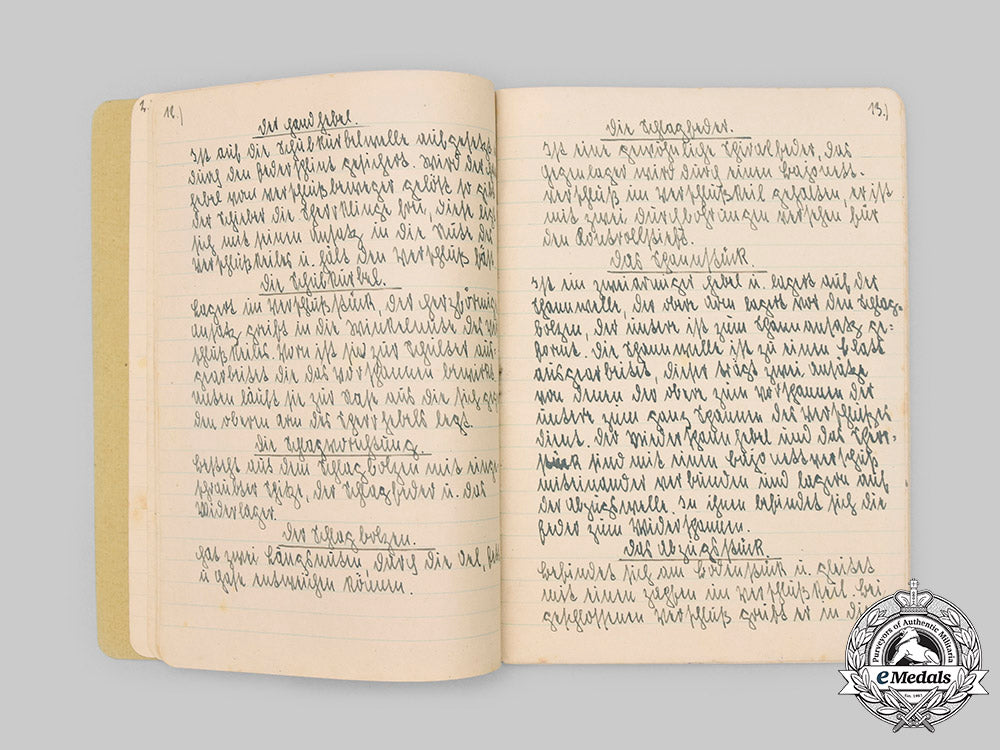The instruction manuals for how to serve on board a Kriegsmarine ship were handwritten by Matrosen-Obergefreiter (private 1st class of the Kriegsmarine) Rolf Lichtblau during his training to become a sailor. They include dress regulations, rules of conduct, as well as instructions on how to perform certain tasks. Several pages show drawn and coloured signal flags and their meanings.